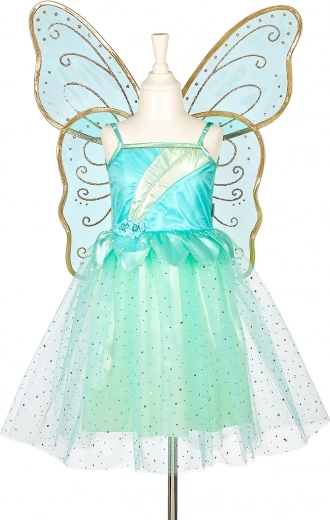 Sukni tvoří saténový základ překrytý vrstvou světle tyrkysového tylu posetého zlatými tečkami, které se krásně třpytí při každém kroku. Součástí jsou také průsvitná tyrkysová křídla se zlatými vzory a lemováním, která se díky pružným gumičkám snadno a pohodlně nasazují – a lze je nosit i samostatně.