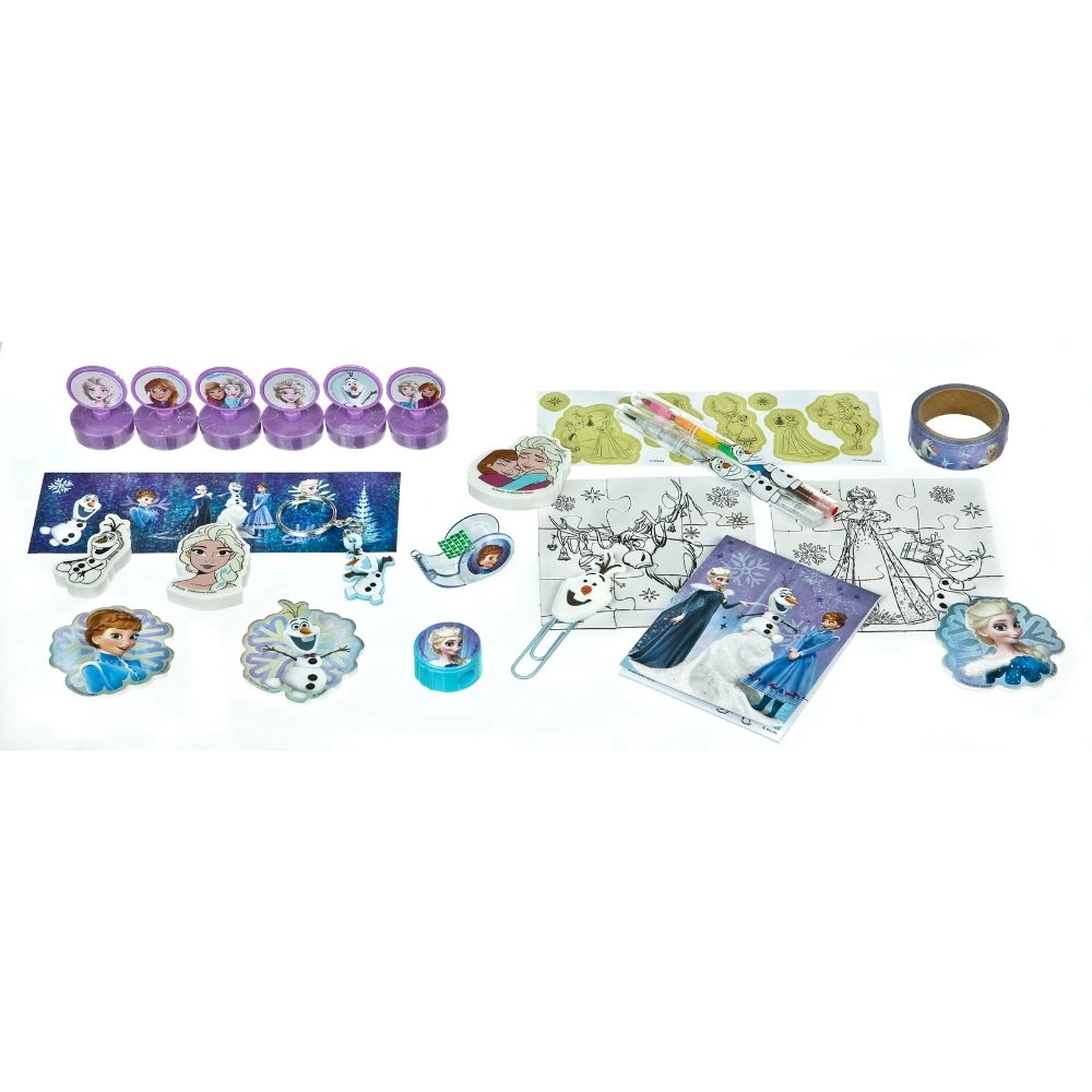 Uvnitř najdete pestrou směs doplňků a školních potřeb – od mini razítek a nálepek až po zápisníček či tvarované gumy. Vše sladěno do zimního světa FROZEN, aby byl každý den adventu opravdu magický.
