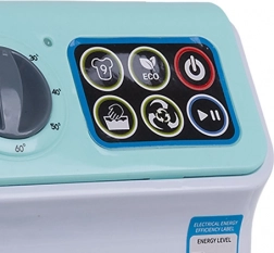Děti si zamilují panel s tlačítky, otočný volič teploty a funkce start/stop. Ovládání je intuitivní a připomíná skutečnou pračku.
