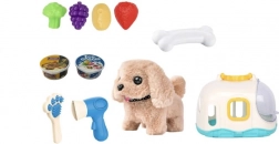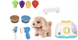 Praktický domeček slouží jako útulné zázemí i přenosný kufřík, takže si děti mohou pejska vzít kamkoliv. V balení najdou i příslušenství pro péči – hřebínek a fén – a plastové dobroty ve tvaru ovoce a zeleniny pro hraní na krmení.