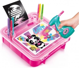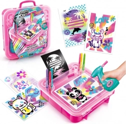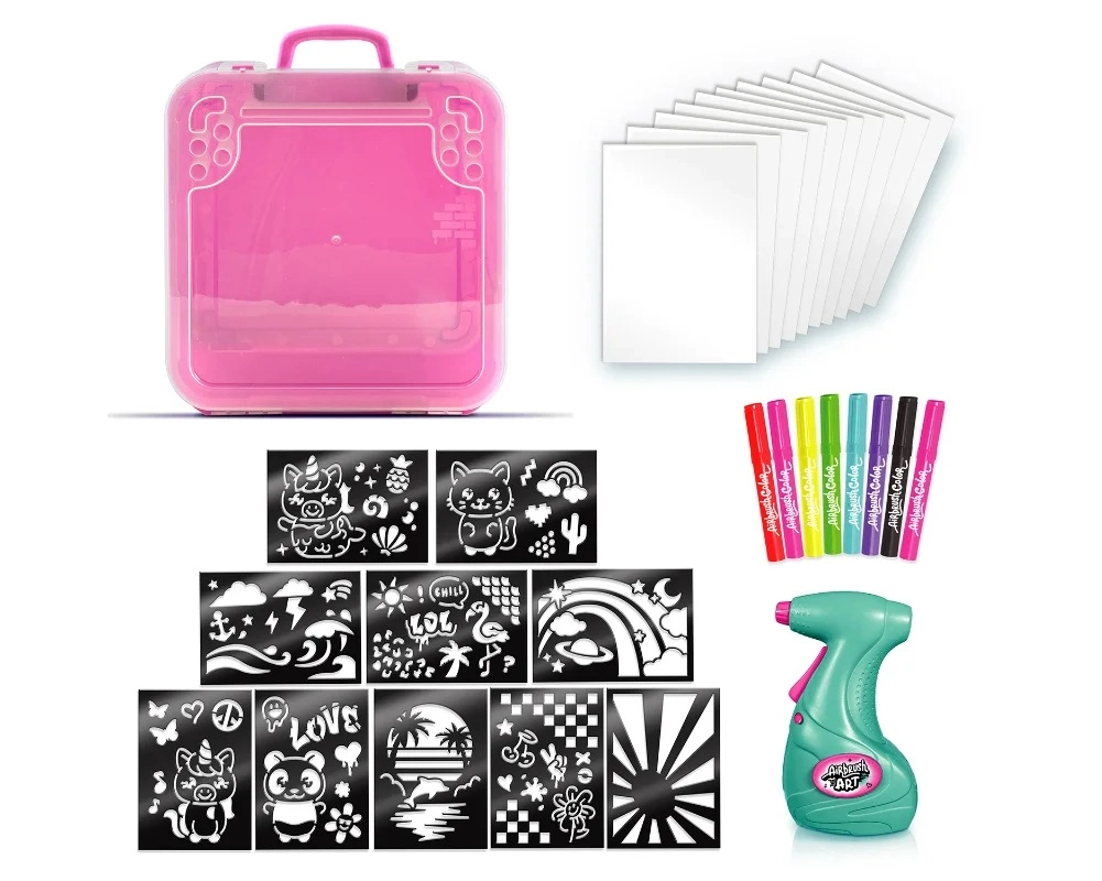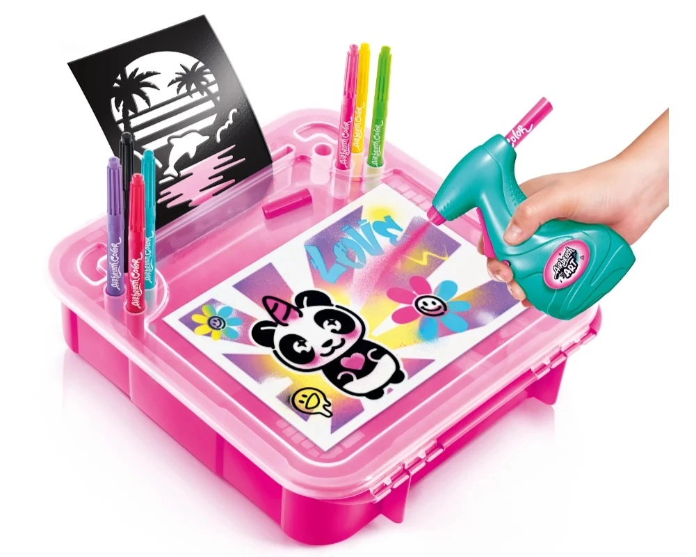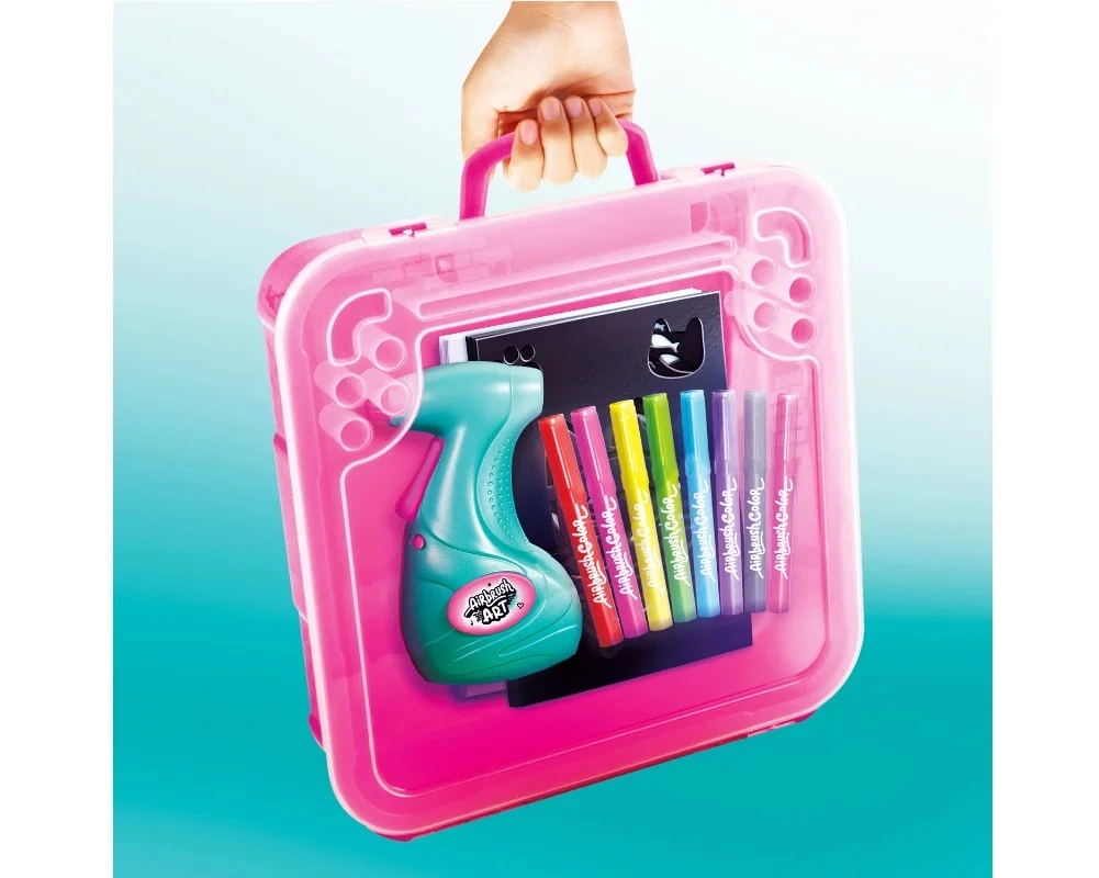 Lehký a přenosný kufřík ukrývá vše, co malý umělec potřebuje: airbrush, papíry, šablony a barvy. Díky jednoduchému ovládání a bezpečnému provedení je sada skvělým dárkem, který podporuje jemnou motoriku, kreativitu a sebevyjádření.