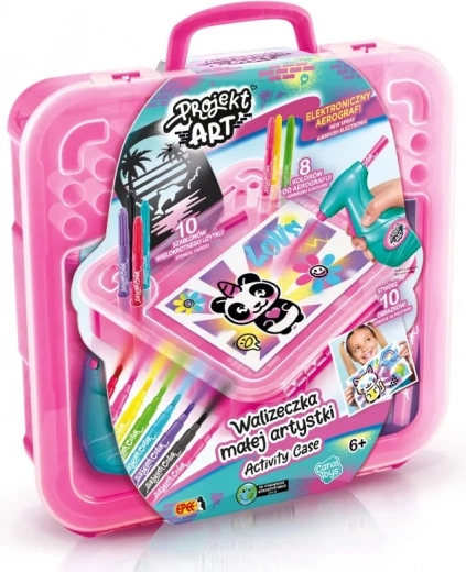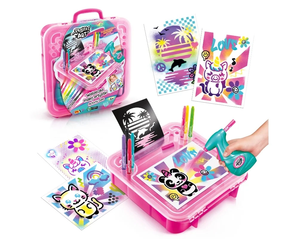 Sada Epee Projekt Art – kufřík malé umělkyně přináší dětem zábavný způsob, jak objevovat umění. Stačí přiložit šablonu, rozprašovat barvu pomocí elektronického airbrushe a sledovat, jak vznikají krásné tvary a motivy. Po dokončení základního motivu mohou děti přidat vlastní kresby a vytvořit originální dílo.