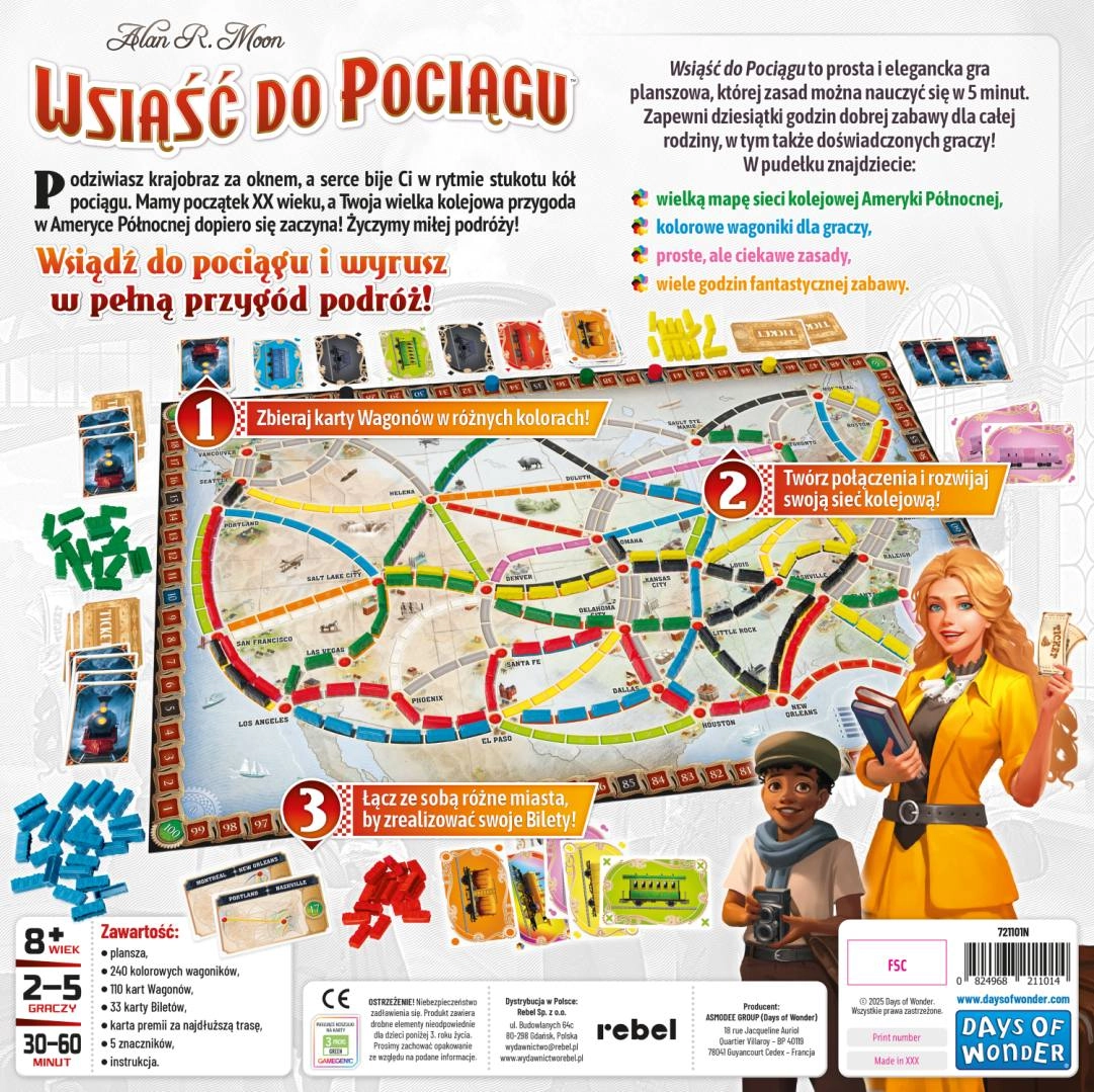 Vydejte se na dobrodružnou cestu napříč Severní Amerikou s rodinnou deskovou hrou Wsiąść do Pociągu. Sbírejte barevné karty vagónů, budujte železniční tratě mezi městy a plňte tajné úkoly pro co nejvíce bodů. Tato edice nabízí aktualizované komponenty a vylepšený design, jednoduchá pravidla a vysokou znovuhratelnost pro děti i dospělé.