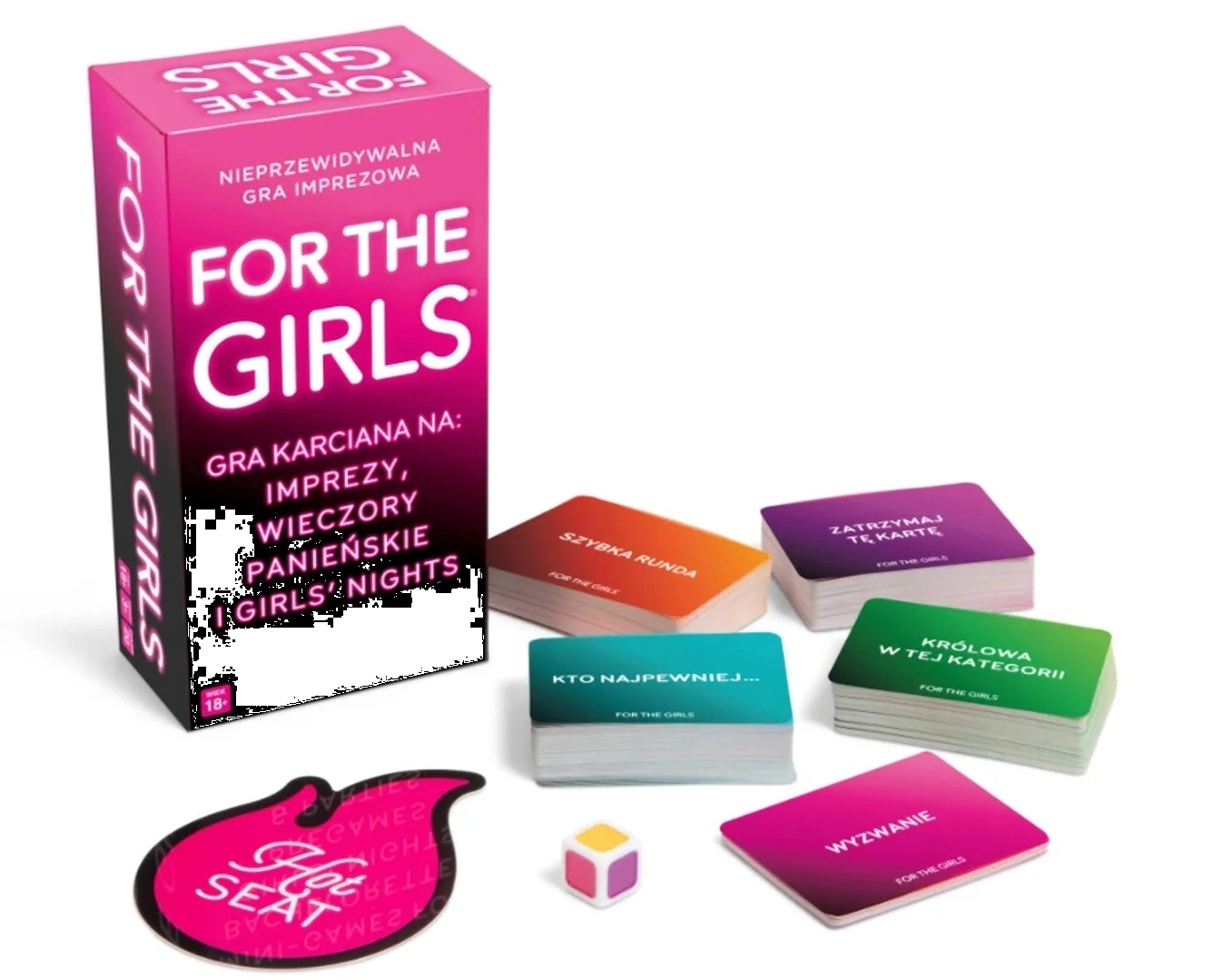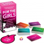 For the Girls je odvážná společenská hra navržená exkluzivně pro ženy. Směsice karet s výzvami, otázkami a hlasováním rozpumpuje každý večer — od rozluček se svobodou po pohodové setkání s kamarádkami. Barva hozené kostky určuje kategorii, růžová spouští Horké křeslo a černá dává možnost vybrat si libovolnou kartu. Vítězí ta, která jako první nasbírá 10 karet… nebo hra končí, když přijede taxi.