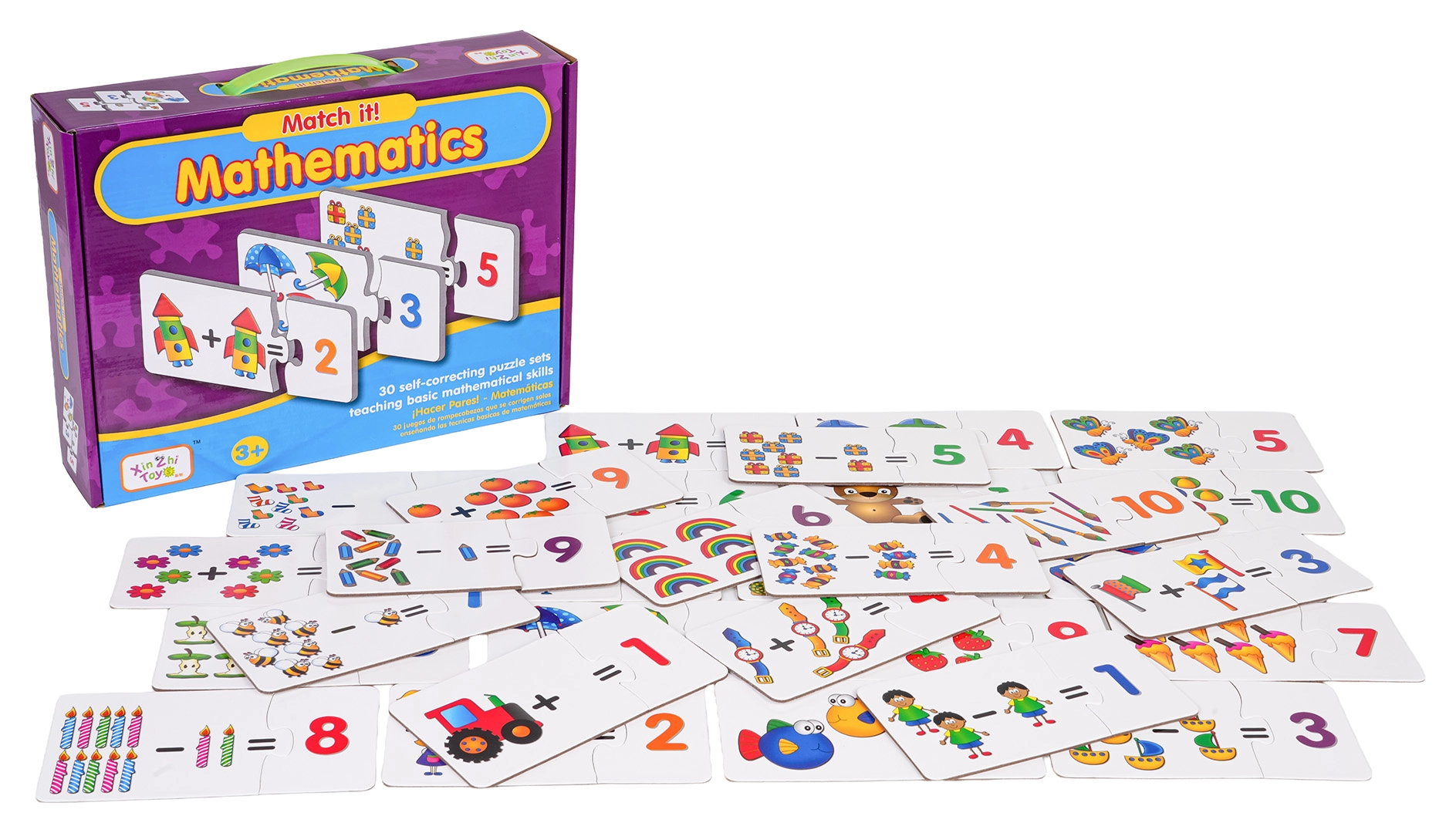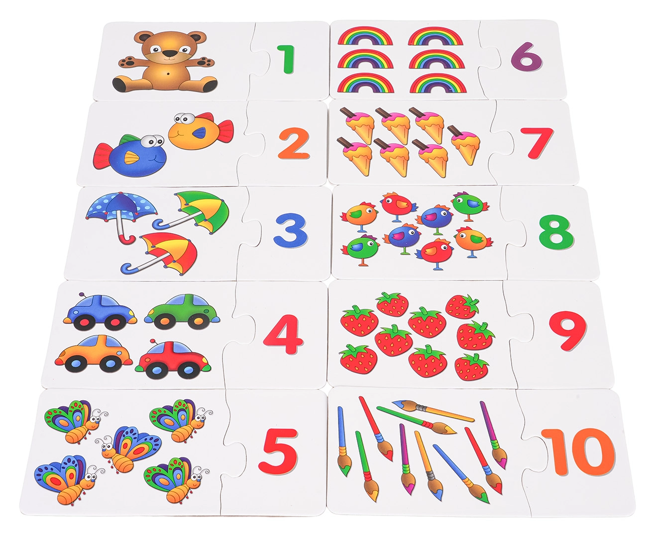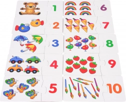 Hrací sada pro děti od 3 let, která spojuje učení počítání a zábavu. Obsahuje 30 samokontrolních dvojic puzzle, kde děti propojují čísla s množstvím a řeší jednoduché úlohy 1–10. Rozvíjí koordinaci ruka–oko, pozornost, vizuální paměť i rozpoznávání barev.