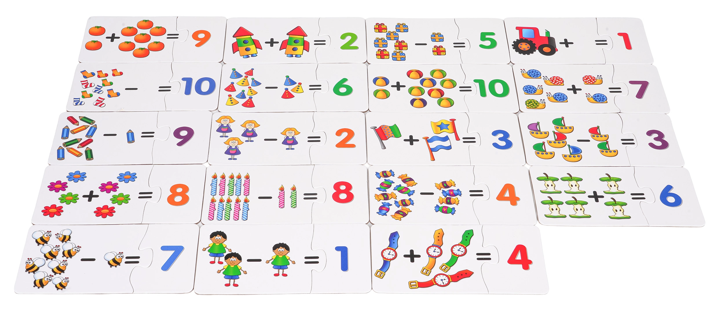 Skládáním správně pasujících dílků si děti procvičí základní aritmetiku a ověří si řešení díky samosprávnému tvaru puzzlí.