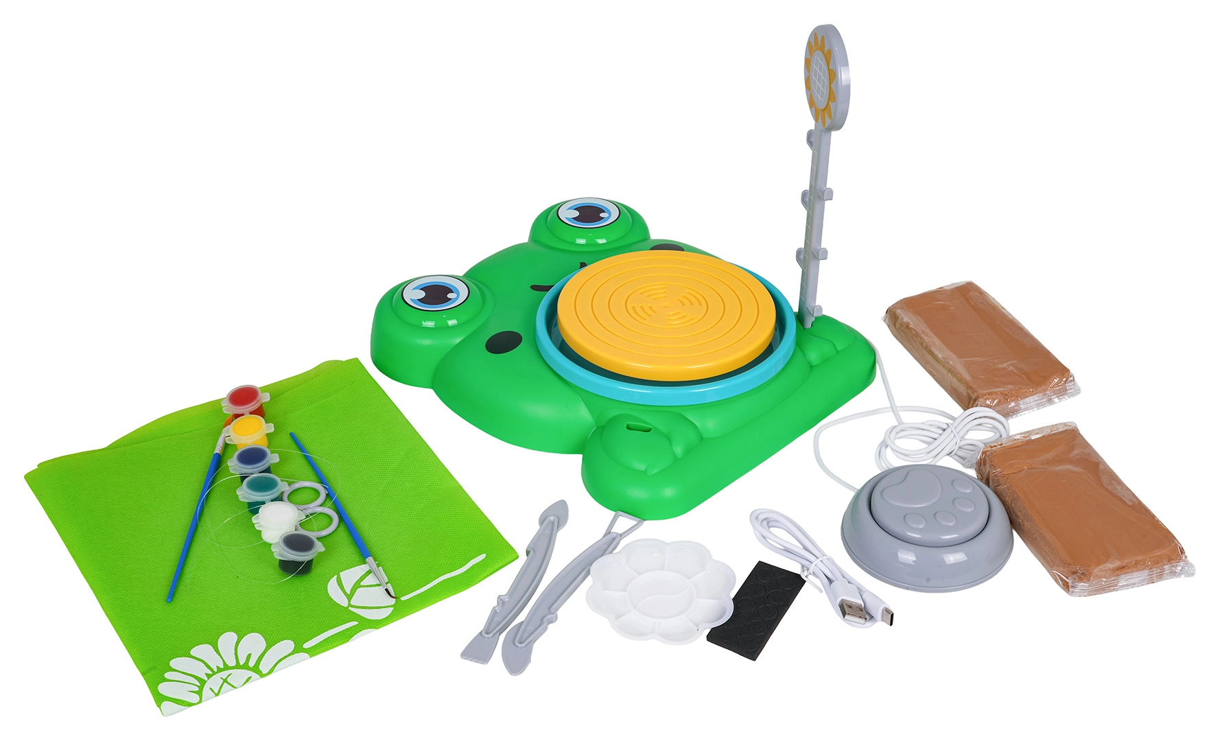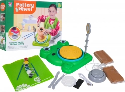 Základna ve tvaru žáby, otáčivé kolečko, nožní pedál, lampička, nástroje, barvy a 2× hlína – vše pro okamžité tvoření a malování.