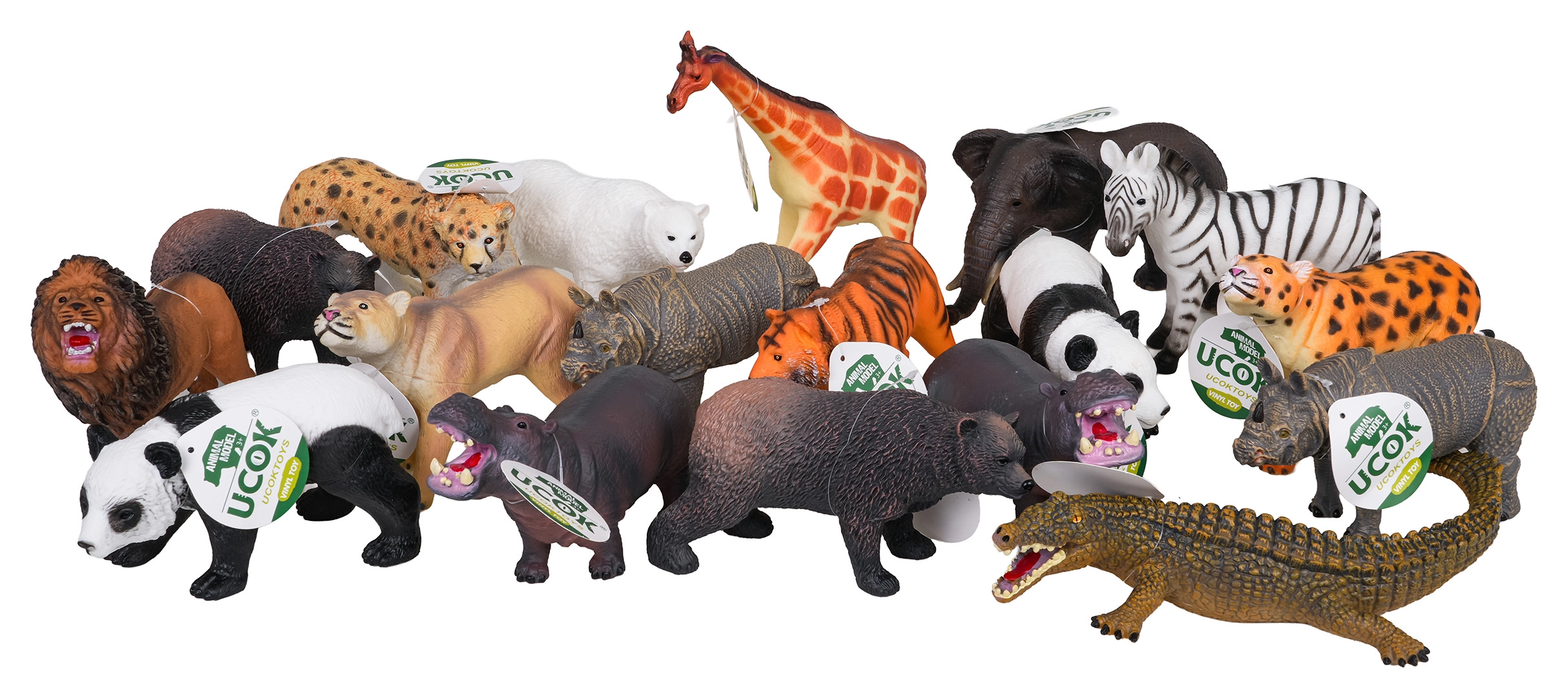 gepard 1 cca 25 × 9 × 12 cm; gepard 2 cca 26 × 12 × 8 cm; panda cca 17 × 9,5 × 10 cm; žirafa cca 20 × 10 × 20 cm; zebra cca 18 × 16 × 7 cm; nosorožec cca 19 × 7 × 10 cm; slon cca 20 × 8 × 12 cm; tygr cca 23 × 9 × 10 cm; hroch cca 19 × 6,5 × 12 cm; lední medvěd cca 19 × 7 × 11 cm; krokodýl cca 31 × 11,5 × 6 cm; medvěd hnědý cca 19 × 6,5 × 10 cm; lev cca 21 × 6,5 × 14,5 cm; puma cca 26 × 12 × 10,5 cm