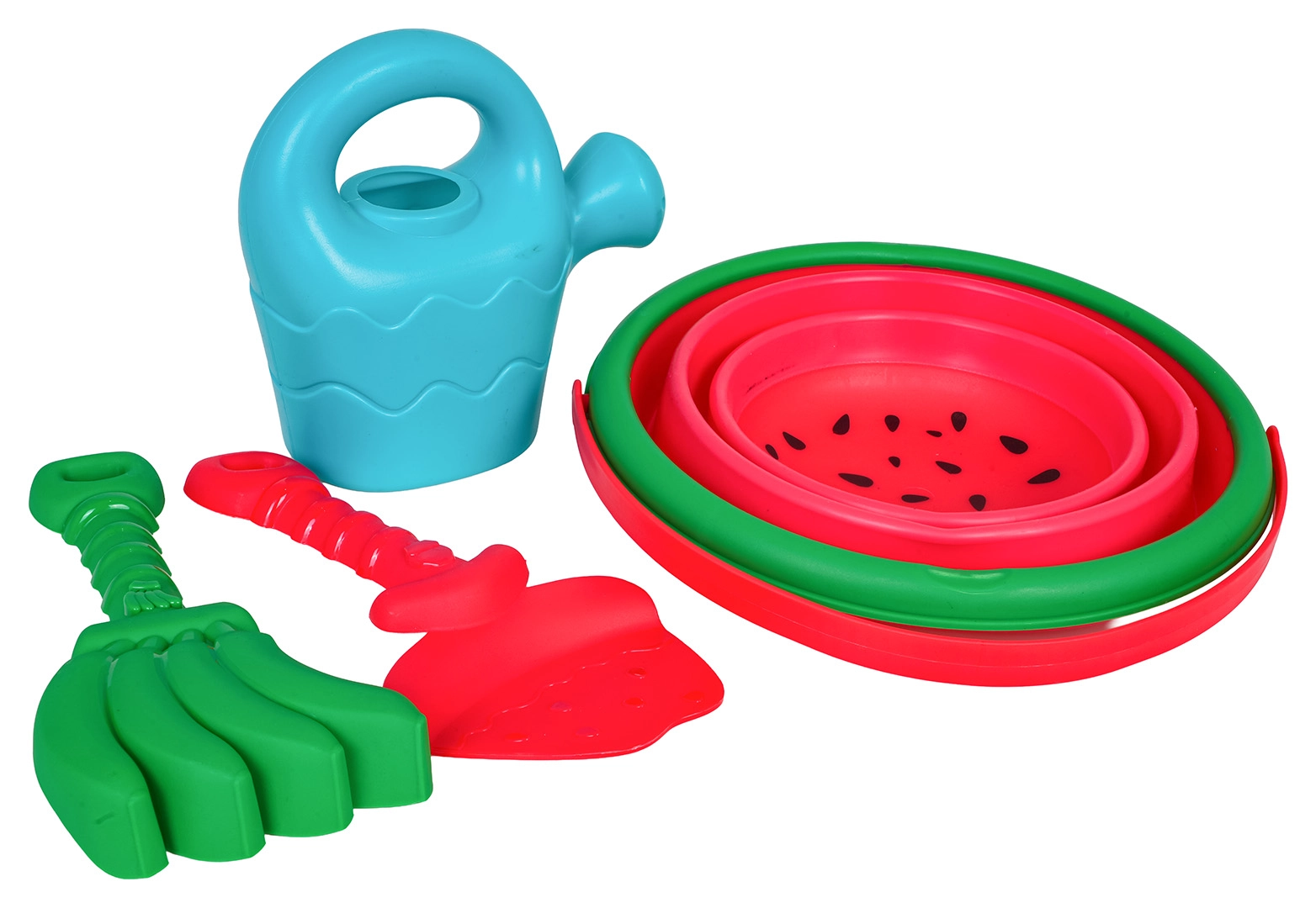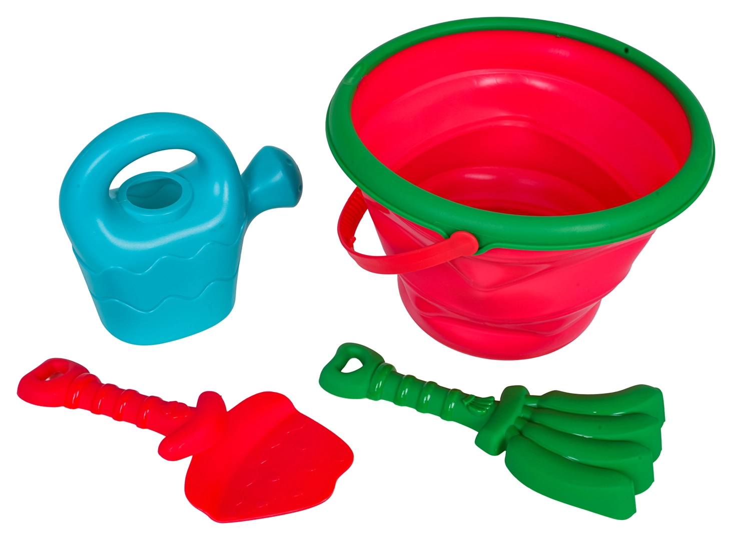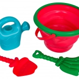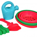 Lopatka, hrábky a konev umožní dětem kopat, hrabat, formovat i přelévat vodu – vše v jednom setu.