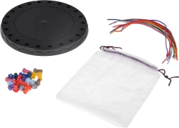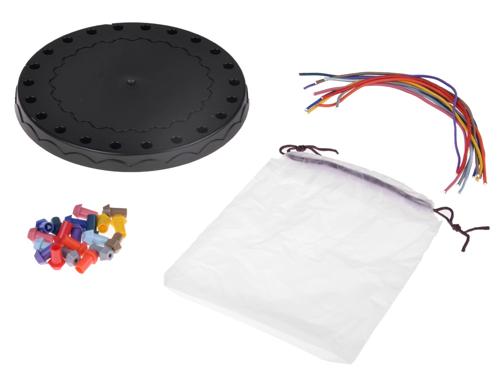 Kruhová deska, sada kolíčků i šňůrek a praktický sáček pro přenášení – ideální na cesty i do školy.