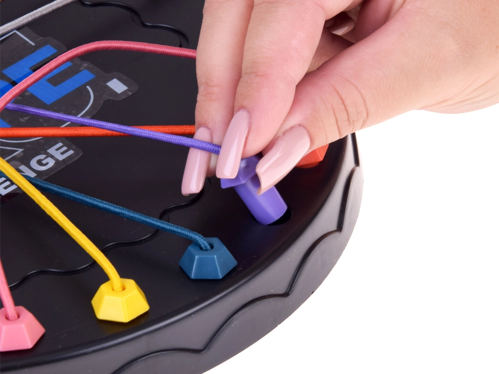 - Jak se hraje: zvolte barvu kolíčků, upevněte šňůrky a vytvořte vzor; poté hledejte postup, jak šňůrky v pravém pořadí uvolnit, aby šly postupně celé vyjmout.