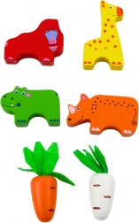 dřevěné auto se sundávací střechou, 6 mrkviček (cca 8 cm), 8 magnetických robáčků (cca 5,5 cm), 2 figurky s magnetem (cca 6,5 cm), 6 zvířátek do sorteru
