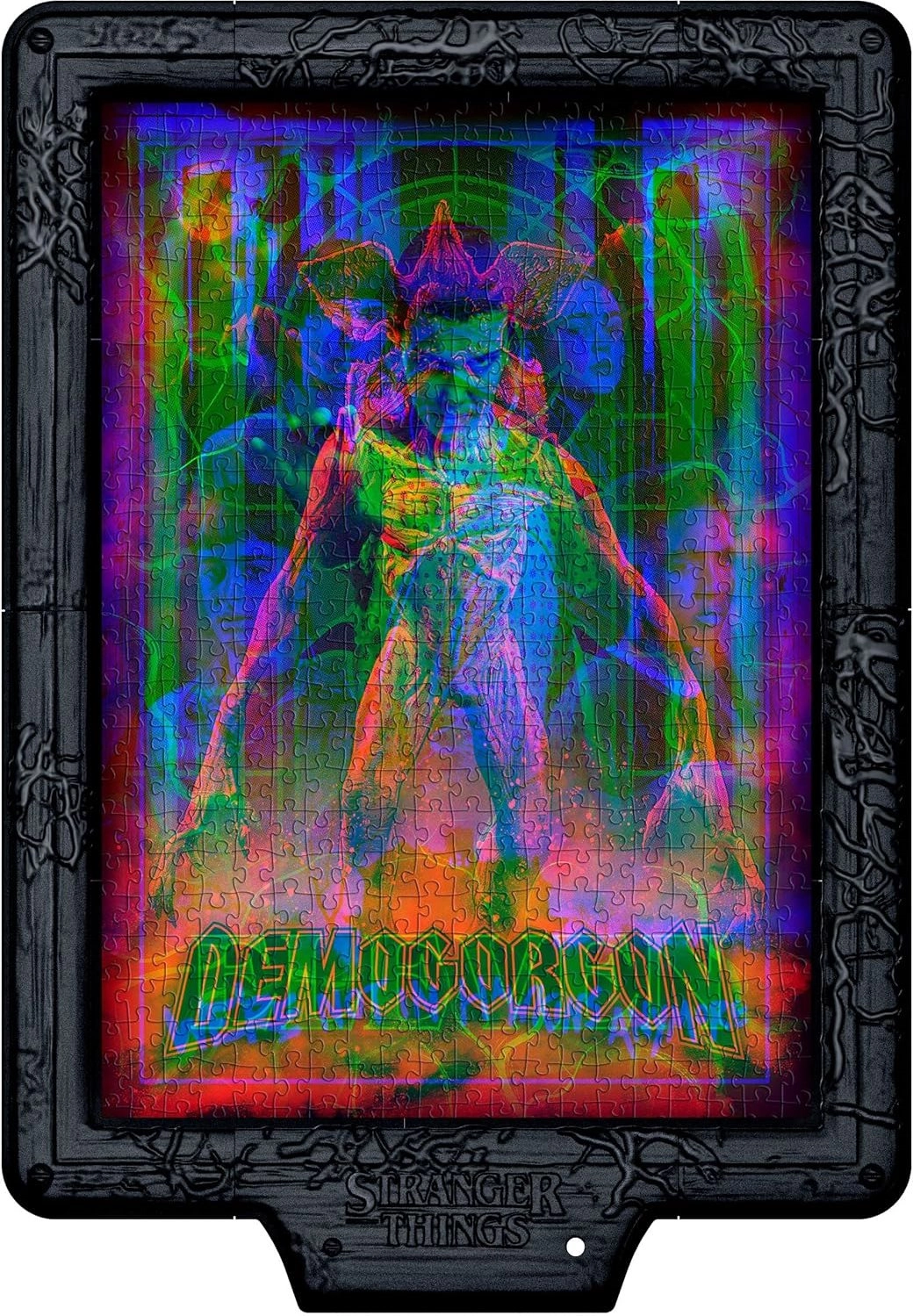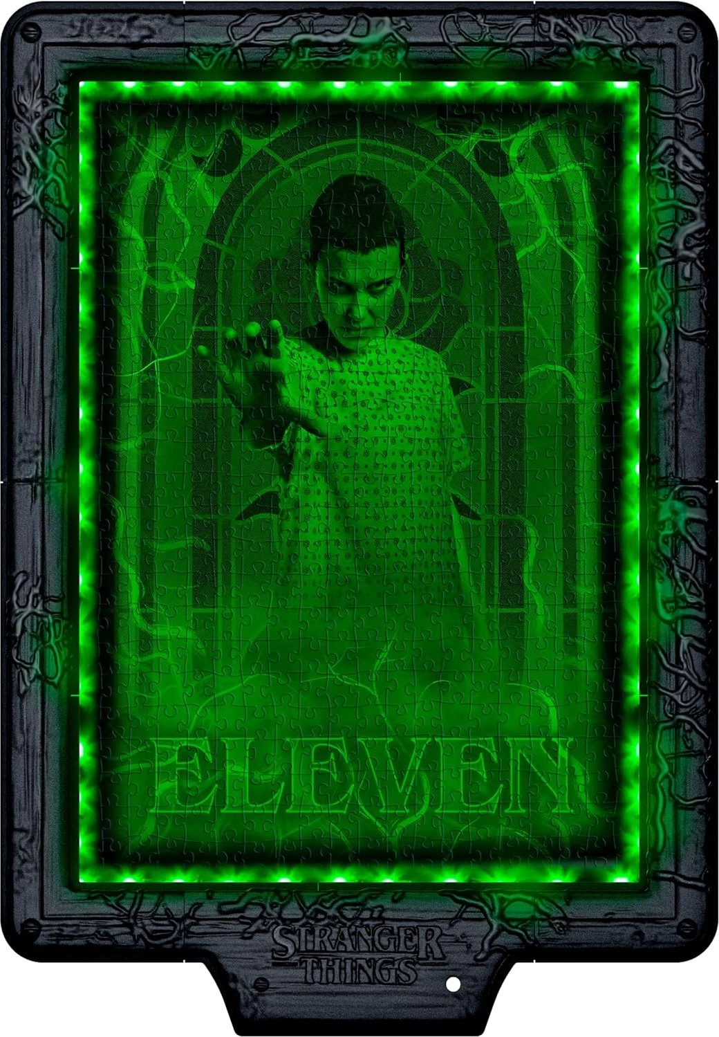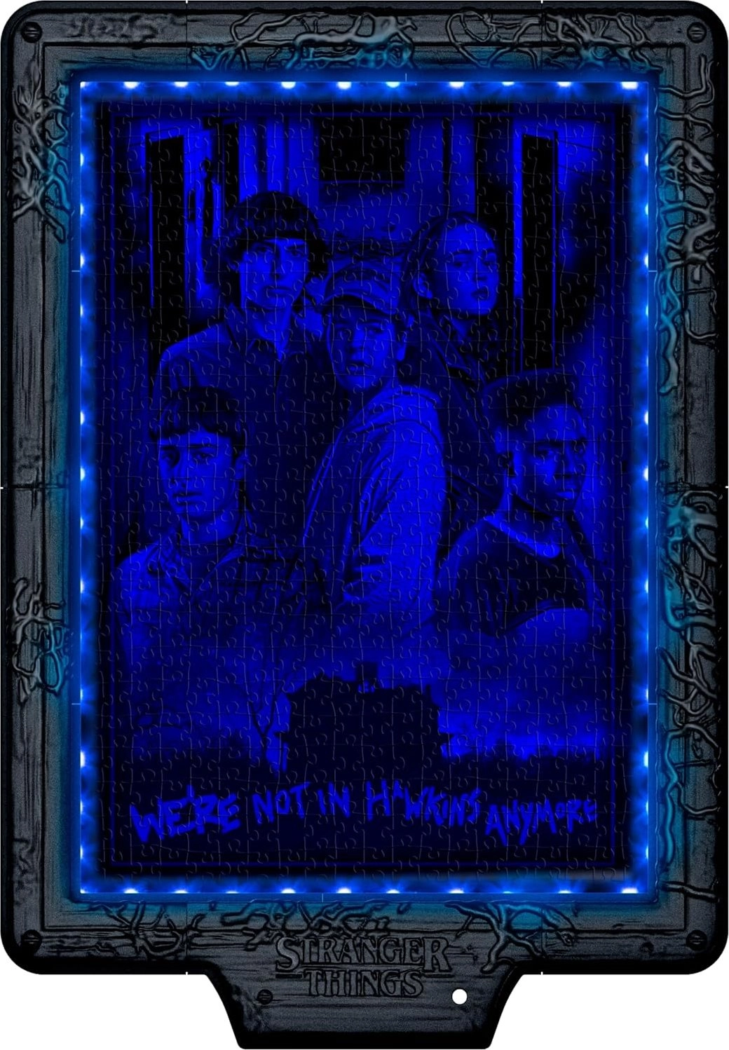 Toto jedinečné puzzle přináší filmovou atmosféru seriálu STRANGER THINGS do vašeho domova. Díky integrovanému elektronickému modulu a RGB LED pásku se obraz při rozsvícení promění – každá barva LED odhalí jinou vrstvu scény s Lovem Demogorgona. Při běžném osvětlení uvidíte kompozici s překrytím tří barevných úrovní, v temnu pak každý odstín vykreslí nový detail.