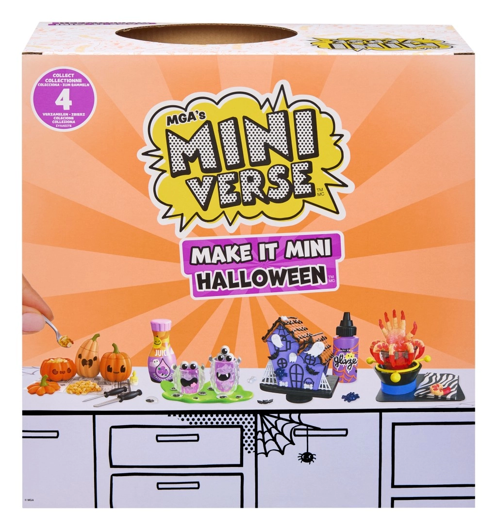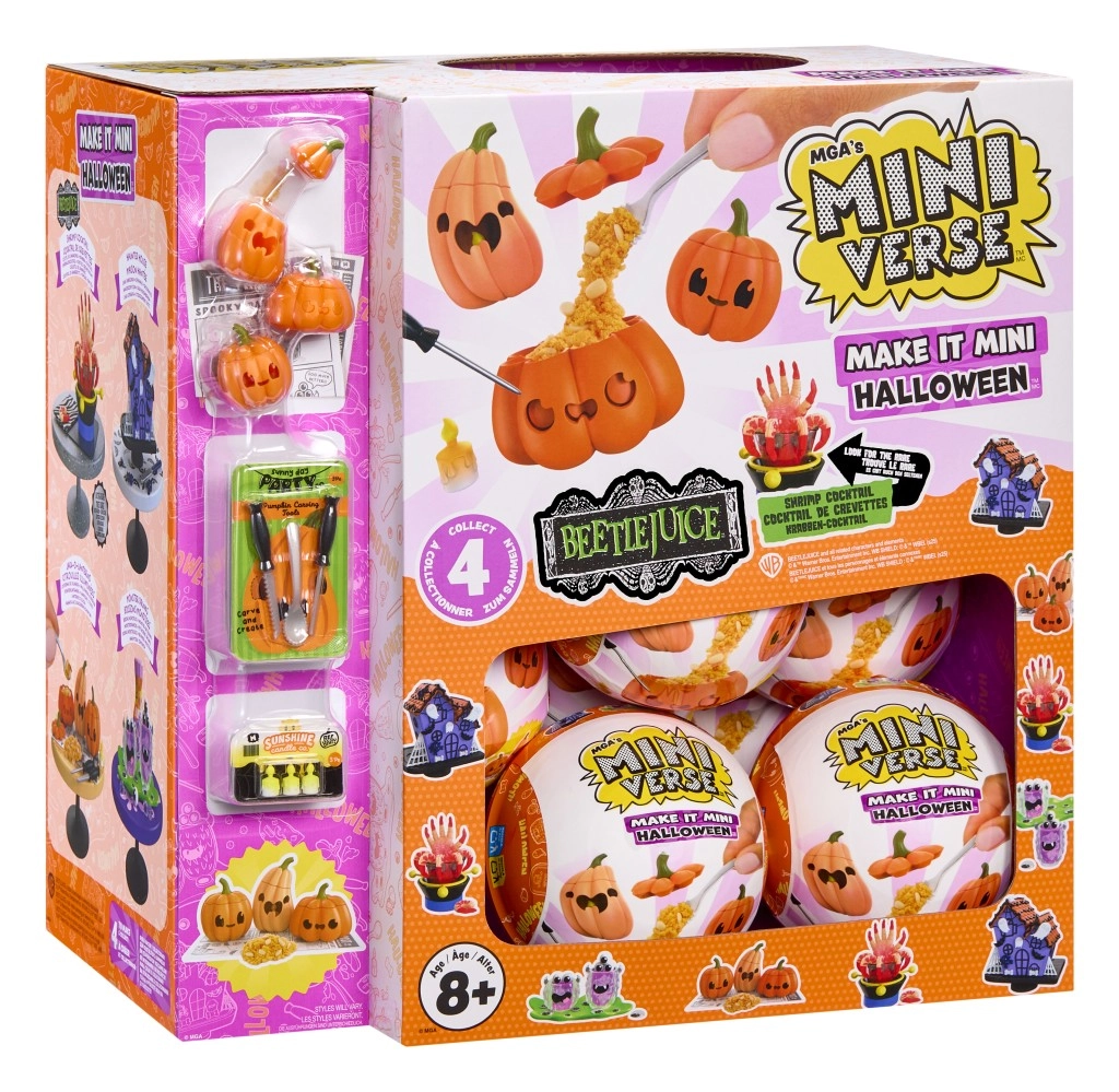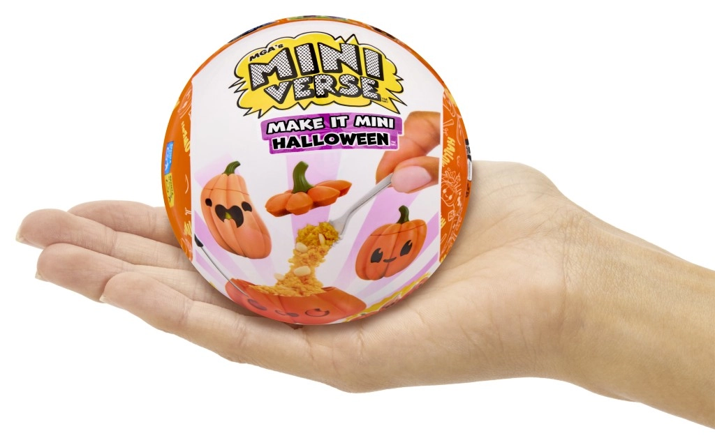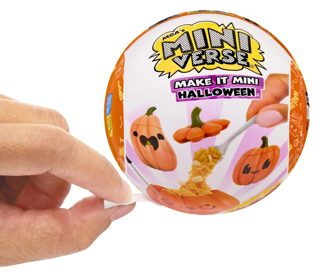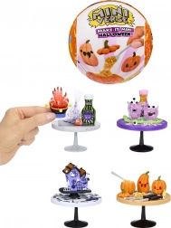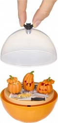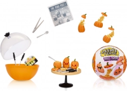 Každá kulatá kapsle MINI VERSE je zapečetěná, takže nikdy nevíš, jaký strašidelný set získáš – dýně, drinky, dekorace a další.