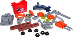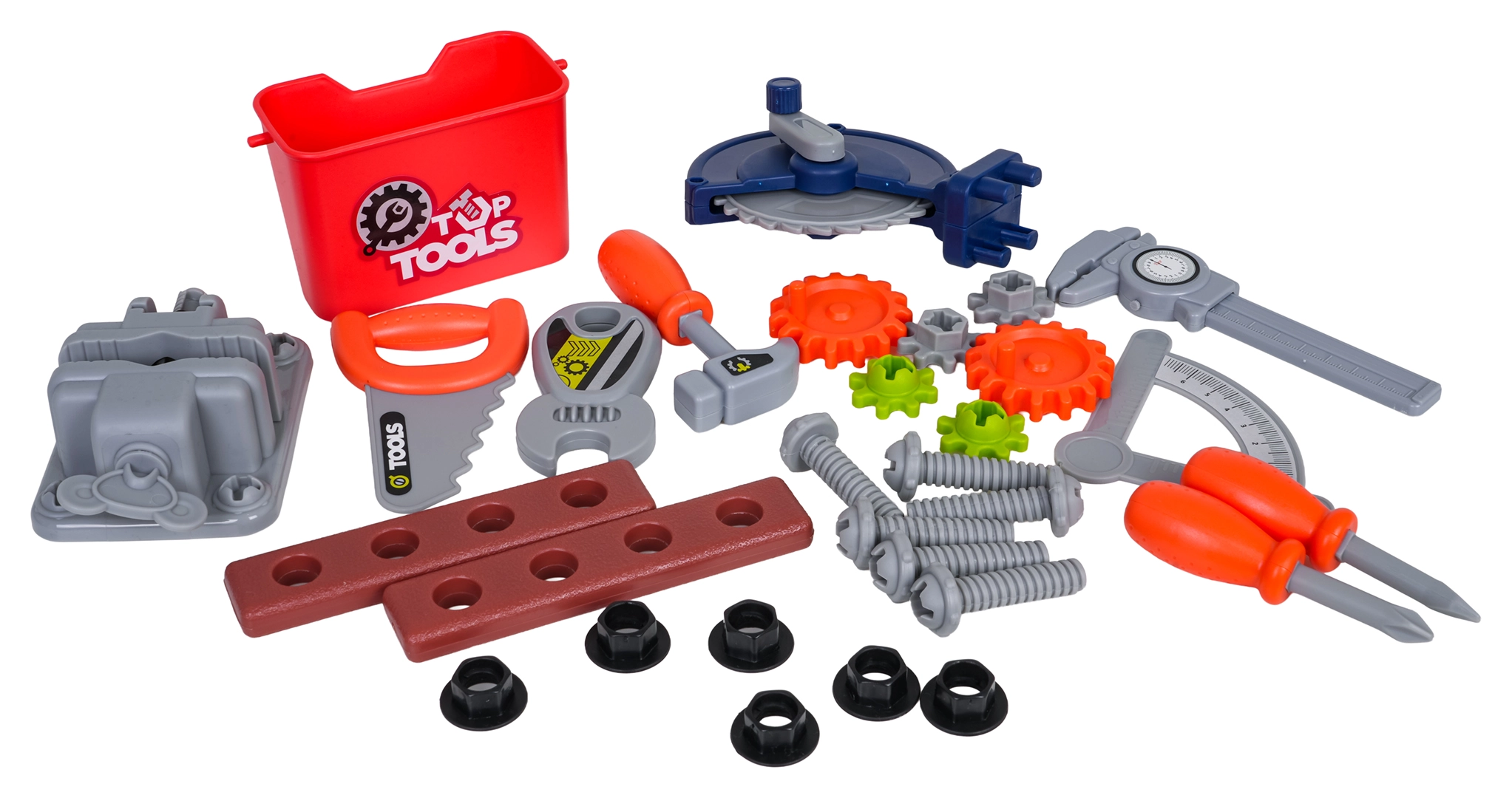 - 2× kufr, díly pro sestavení ponku, box na nářadí, svěrák, 6× ozubené kolo, pila, 2× díl pro šroubování, posuvné měřidlo (suvmijka), 3× nástrčná hlavice, plochý a křížový nástavec, nástavec s „kladívkem“, úhloměr nastavitelný, nastavitelný klíč, 6× šroub, 6× matice/nasazovací díl, dekorativní samolepky