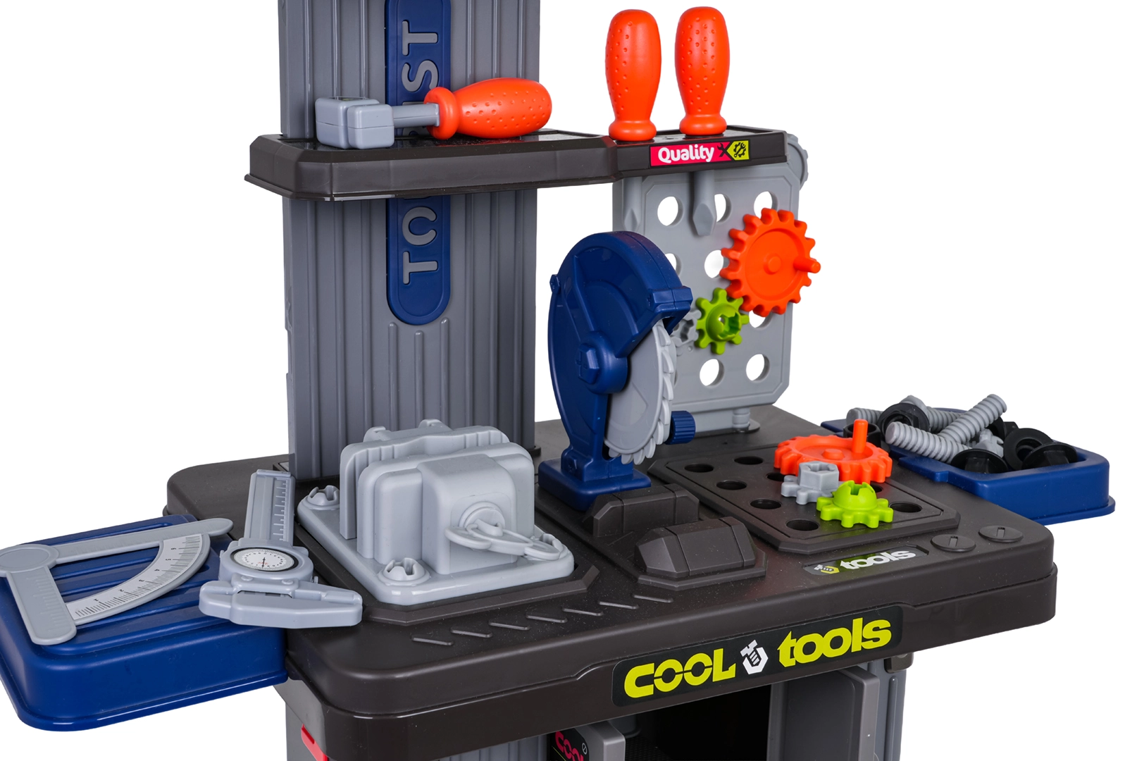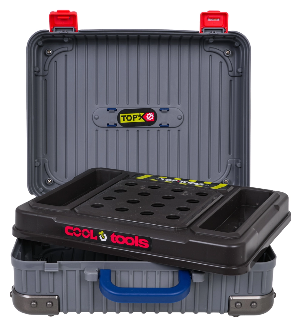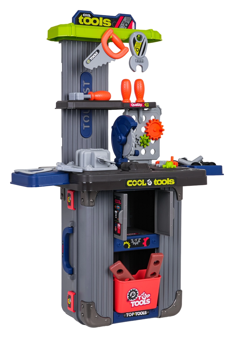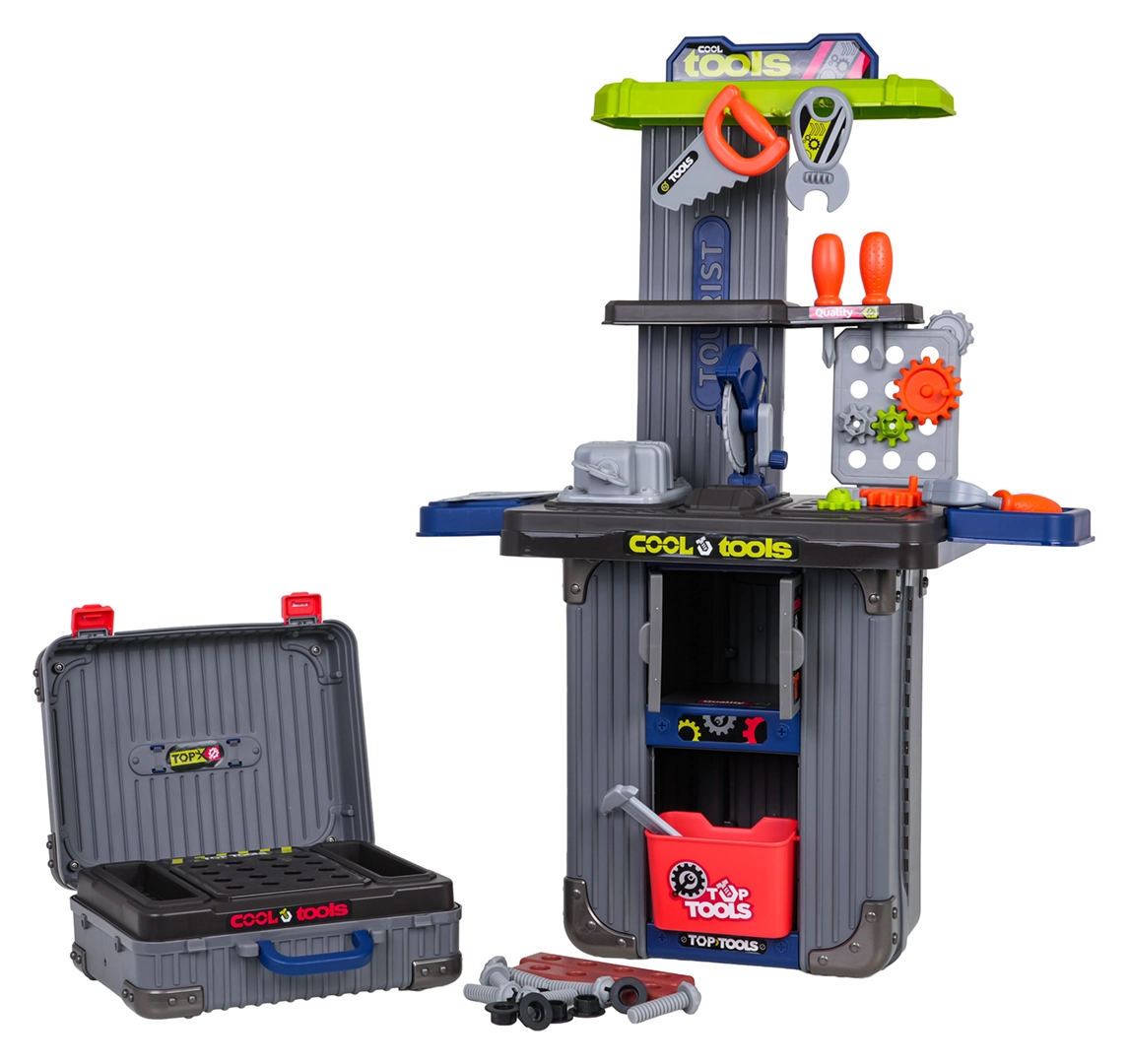 Tento chytrý set 3v1 kombinuje dva kufříky a bohatou sadu nářadí do jednoho přenosného pracovního světa. Děti si snadno sestaví vlastní pracovní ponk se svěrákem, policemi a pegboardem a po hraní vše zase uklidí do mobilních kufrů. Kvalitní plast odolá intenzivnímu používání a zaručí dlouhou životnost.