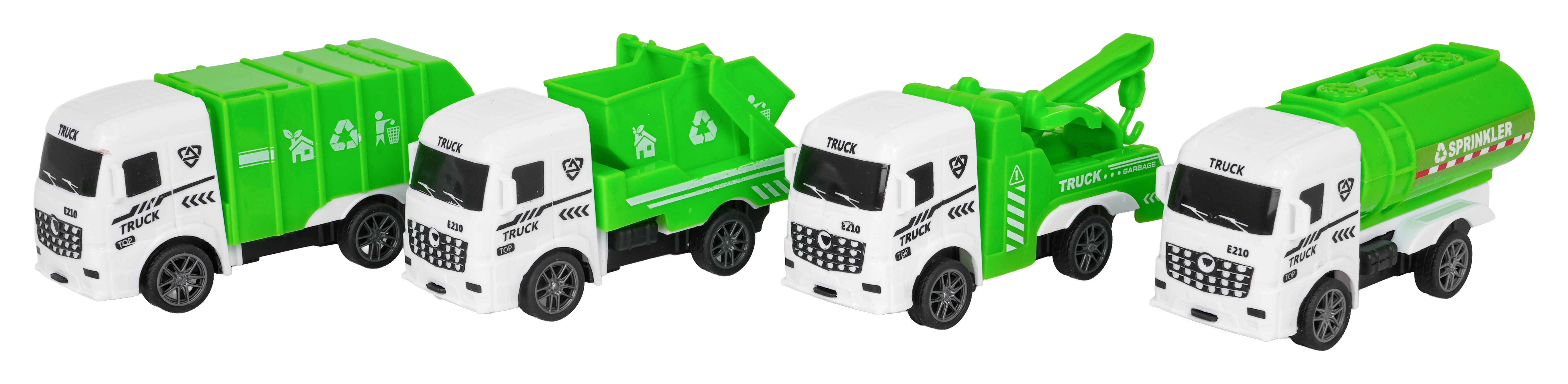 Popelář, sklápěč, odtahovka a cisterna/sprinkler – kompletní tým pro úklid, údržbu a záchranu v ulicích města.