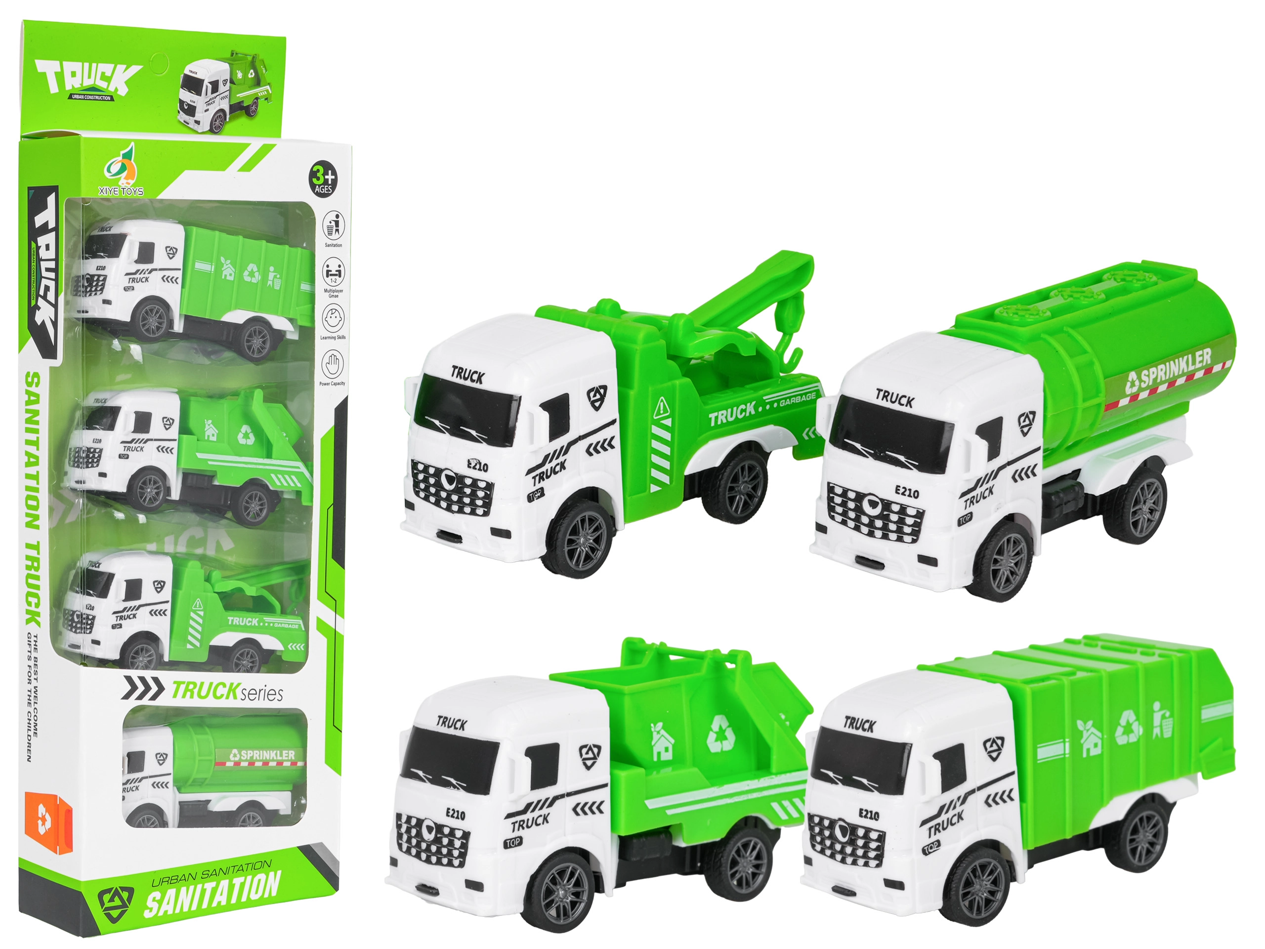 Každé vozidlo nabízí vlastní funkci: popelář má otevíratelné víko, sklápěč vyklápí korbu, odtahovka má pohyblivé rameno a cisterna/sprinkler simuluje údržbu ulic. Sada rozvíjí jemnou motoriku, představivost a vyprávění příběhů – ideální pro malé fanoušky městských strojů.