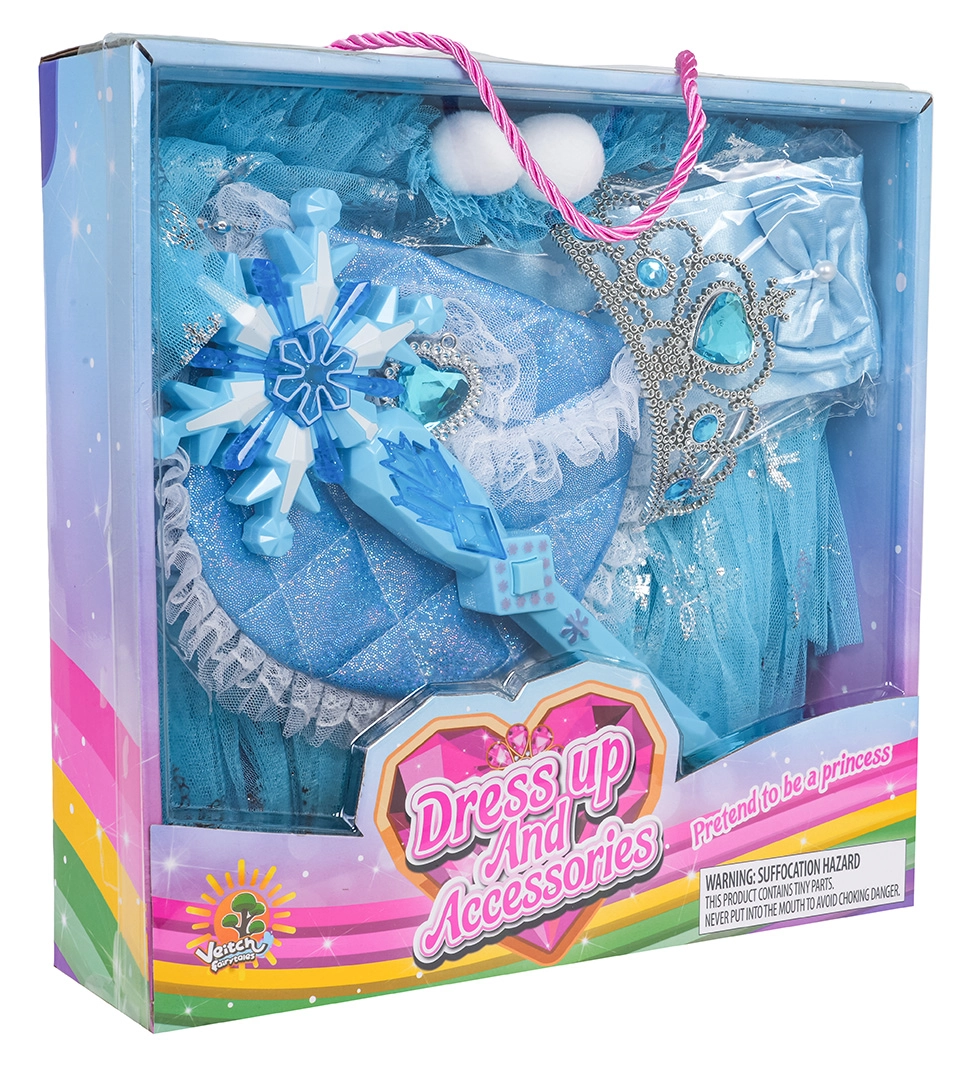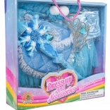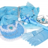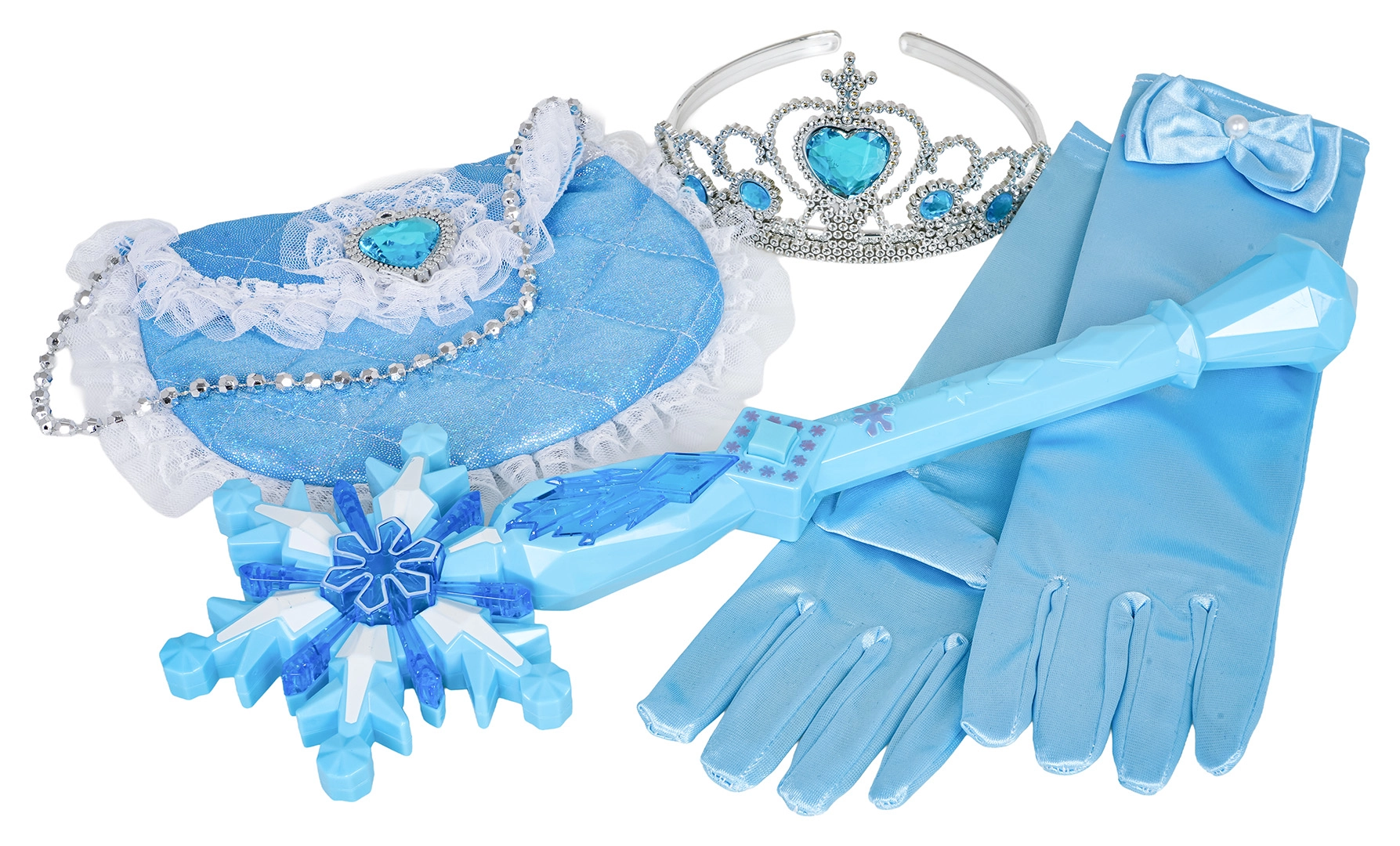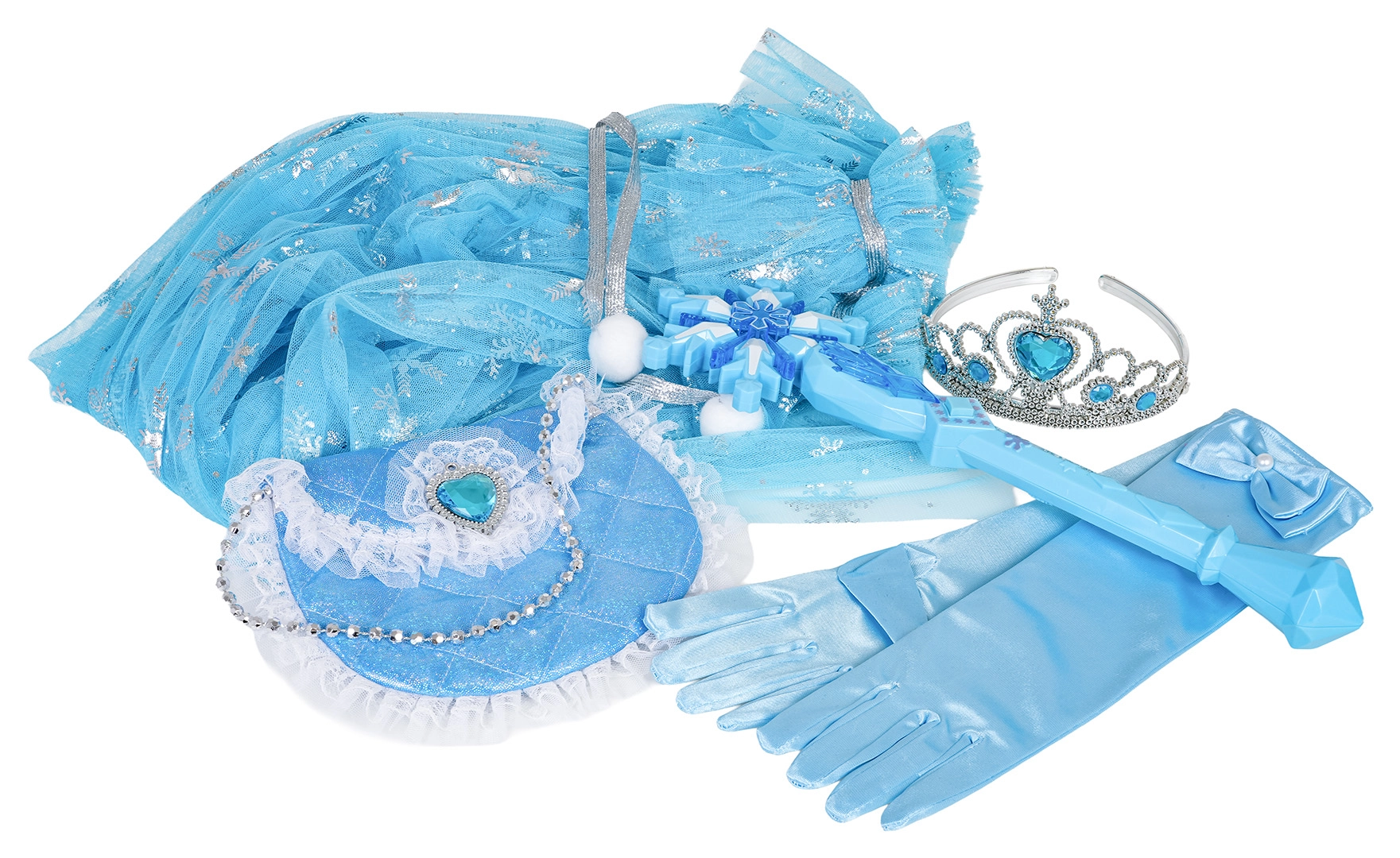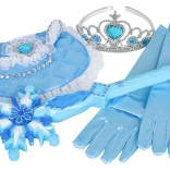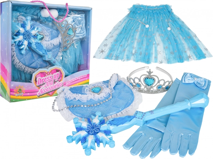 Ladící šaty/sukně, rukavičky, tiara, hůlka a kabelka v jednotném ledově modrém odstínu pro dokonalý pohádkový vzhled.
