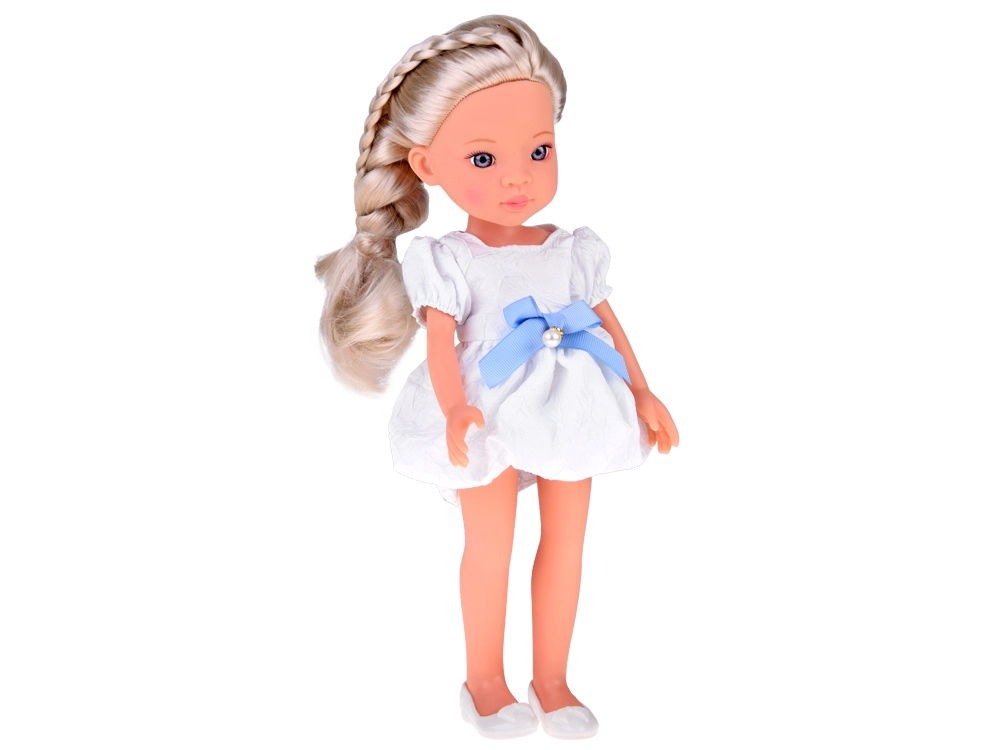 Součástí je půvabná bílá šaty s modrou mašlí a drobným perlovým zdobením a bílé balerínky. Detailně tvarovaná tvář s výraznými, třpytivými očima dává panence realistický výraz a činí z ní krásnou společnici do dětského pokoje i sbírky.