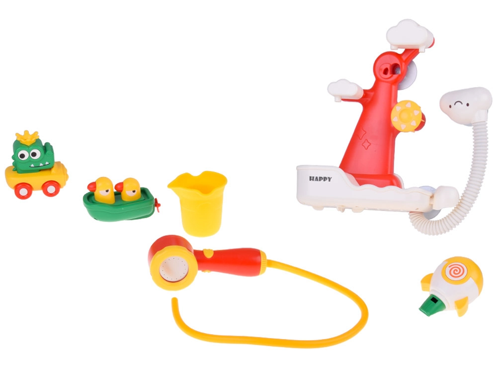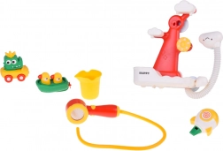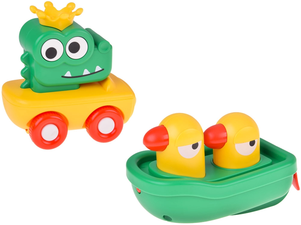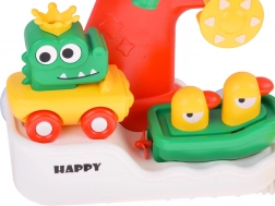 Součástí je krokodýl v autíčku, loďka se dvěma kačenkami a nalévací kelímek. Plovoucí prvky podněcují představivost a prodlužují hravý čas ve vaně.