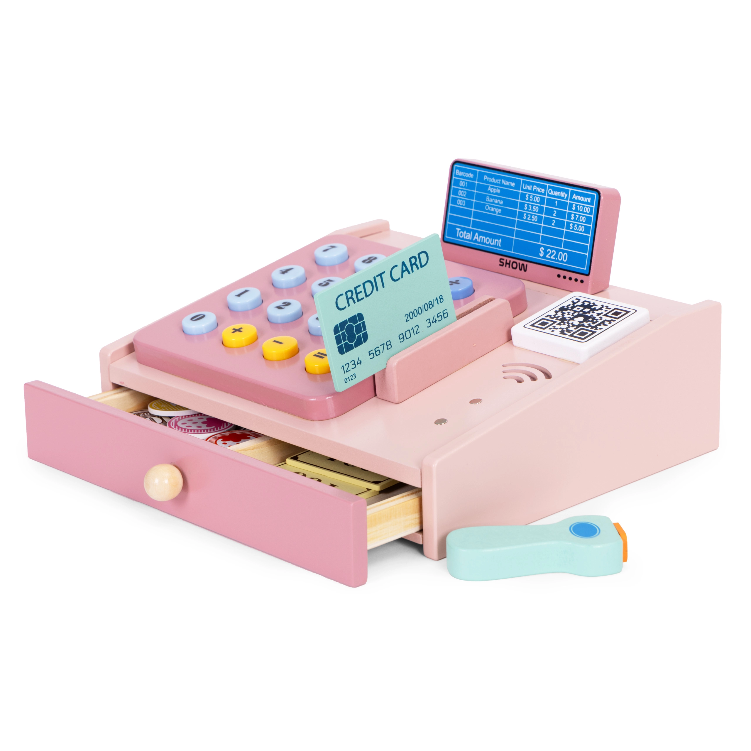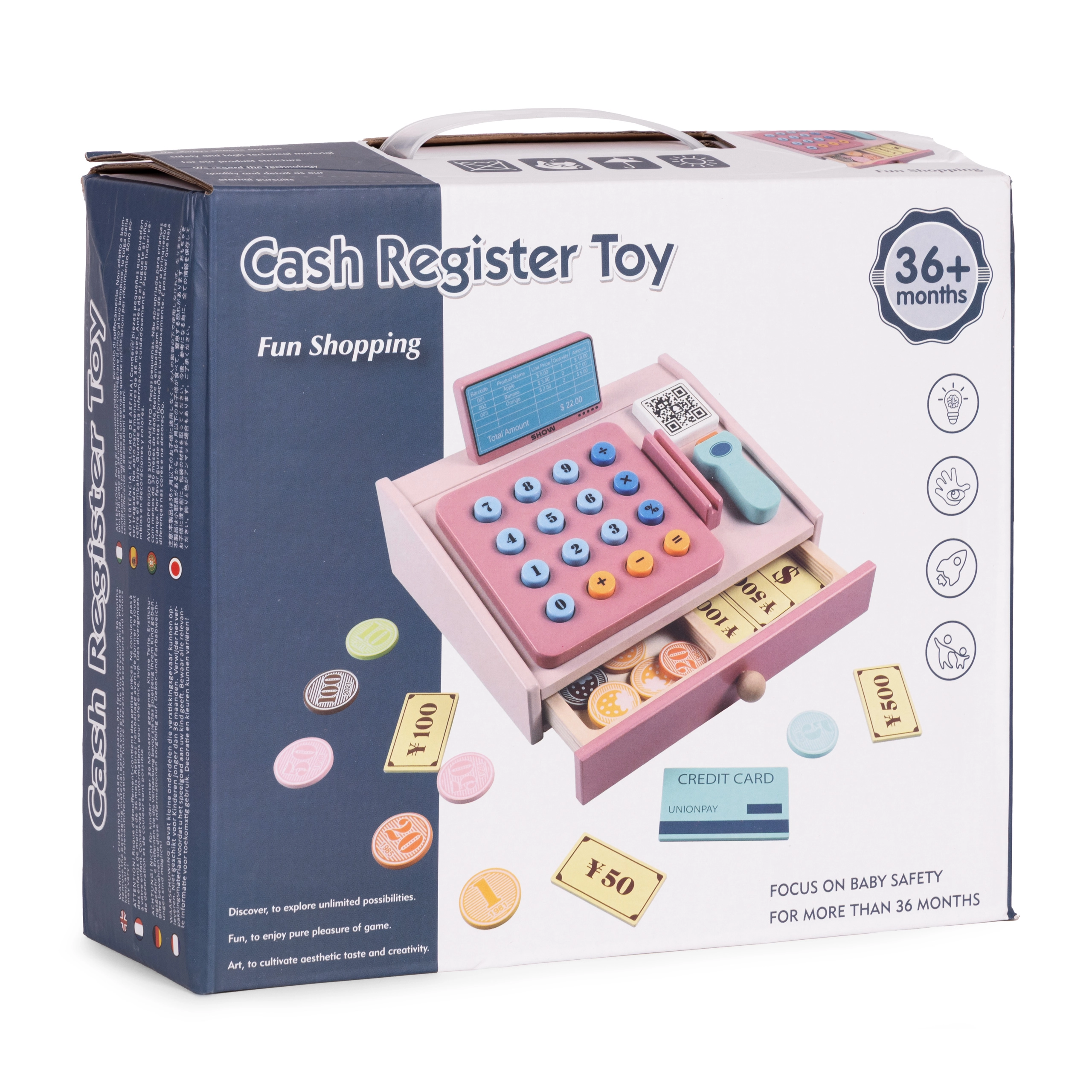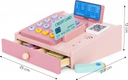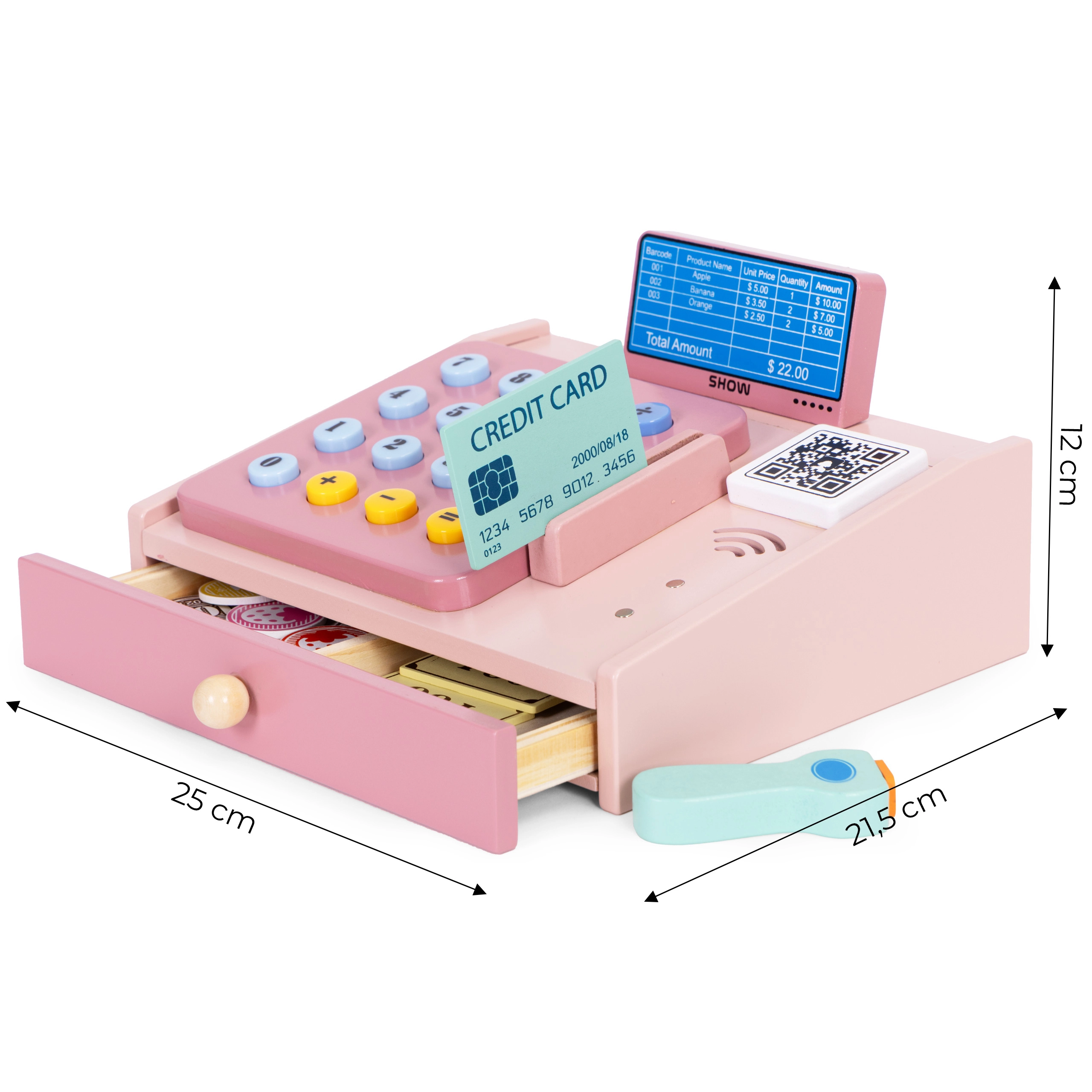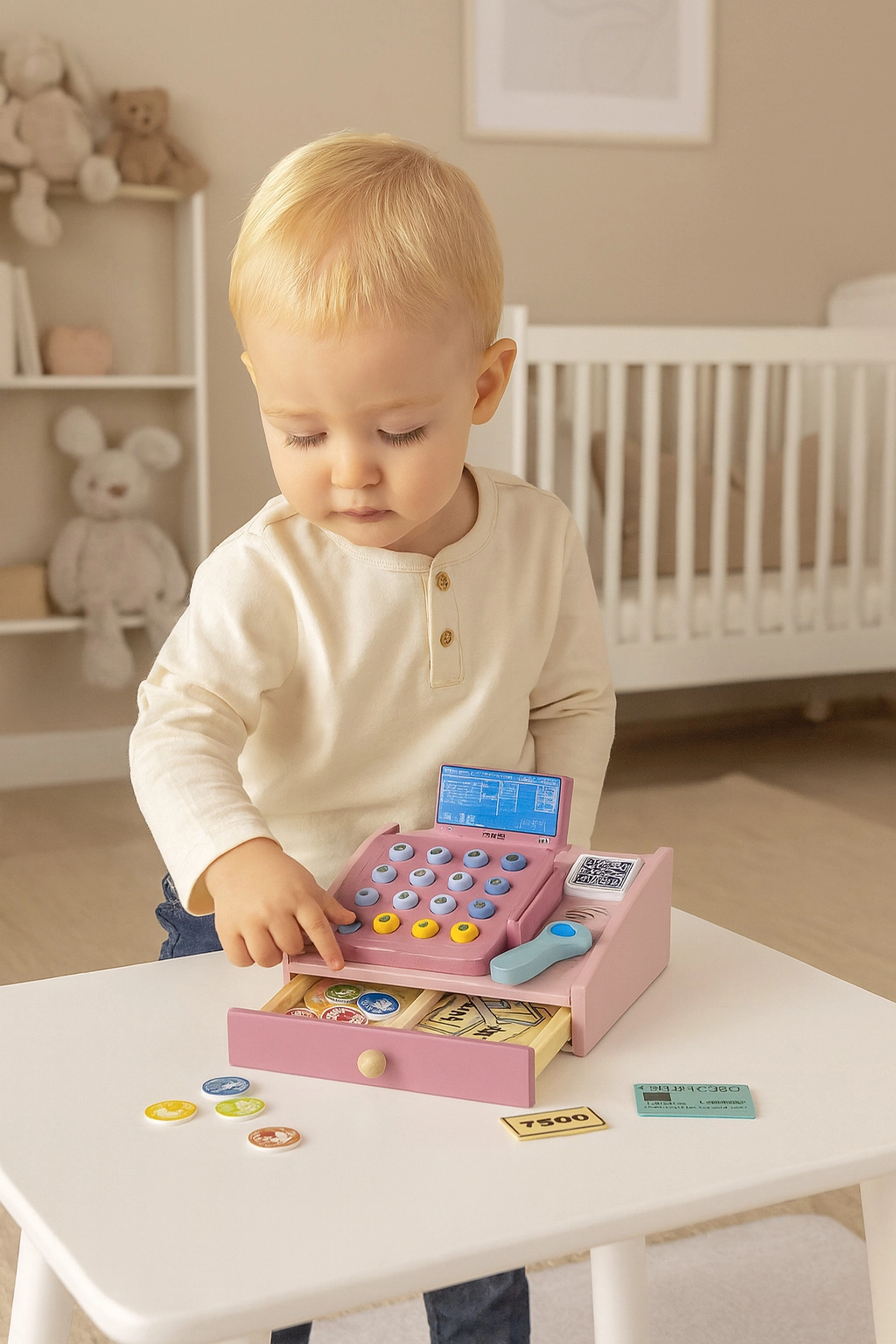 Tato kvalitní dřevěná pokladna v jemných pastelových barvách je perfektním doplňkem do dětského koutku i pokoje. Realistické prvky jako ruční skener, platební terminál, tlačítková klávesnice a výsuvný zásuvník dělají z hraní na obchod zábavnou i vzdělávací aktivitu. Děti si procvičí základní matematiku, logické myšlení a komunikaci.