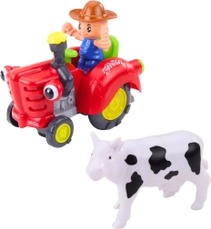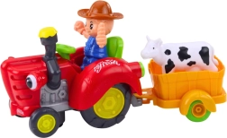 Tento barevný a bezpečný traktor nabízí dětem zábavnou a edukativní hru. Po spuštění se traktor rozjede vpřed i vzad, v komínku a "očičkách" se rozsvítí světýlka a ozvou se veselé melodie a pozdrav. Děti mohou převážet kravičku na přívěsu a vytvářet si vlastní farmářské příběhy.