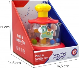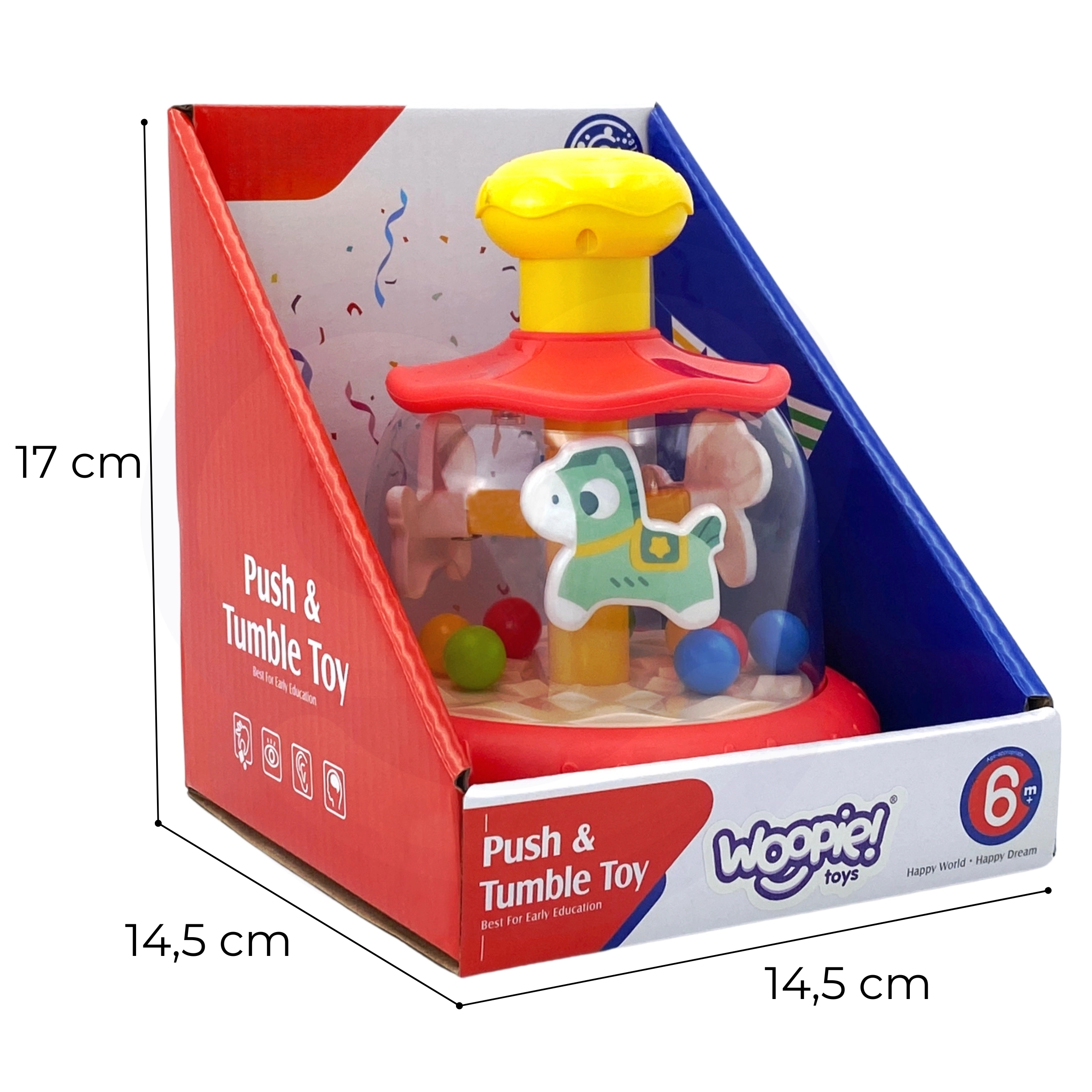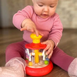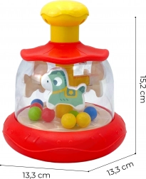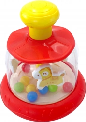 Tento barevný točící kolotoč s koníkem a kuličkami potěší každé miminko. Stačí stisknout žluté horní tlačítko a vnitřní kolotoč se roztočí – kuličky se rozproudí a vytvářejí poutavou podívanou i jemné chrastění. Hračka přináší zábavu i rozvoj smyslů v jednom.