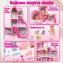 Objevte kouzelný třípatrový domeček pro panenky v růžové barvě s bohatým vybavením a nočním osvětlením. Sada obsahuje 296 dílů, včetně roztomilého nábytku, doplňků, panenky, zjezdovky/klouzačky, schodů a terasy – vše pro kreativní a fantazii rozvíjející hru.