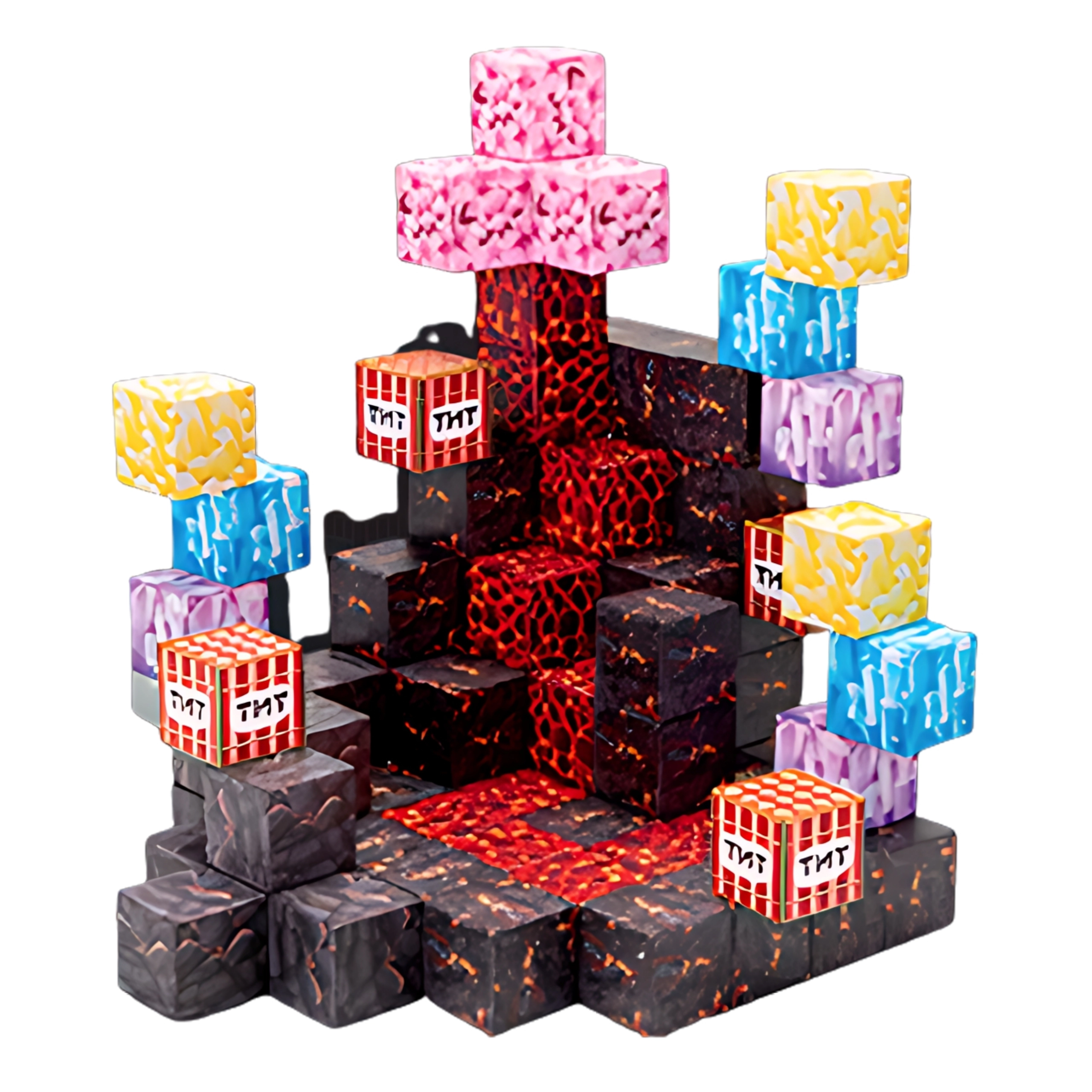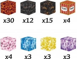 - 30× červeno-černé kostky; 12× šedé kostky; 16× černo‑oranžové kostky; 4× kostky TNT; 4× růžové kostky; 3× modré kostky; 3× fialové kostky; 2× žluté kostky
