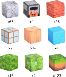 - 14× kostka (kámen), 19× kostka (tráva), 15× kostka (listí), 15× kostka (cihla), 15× kostka (voda), 14× kostka (dřevo), 14× kostka (země), 1× kostka (pec), 1× kostka (speciální vzor)