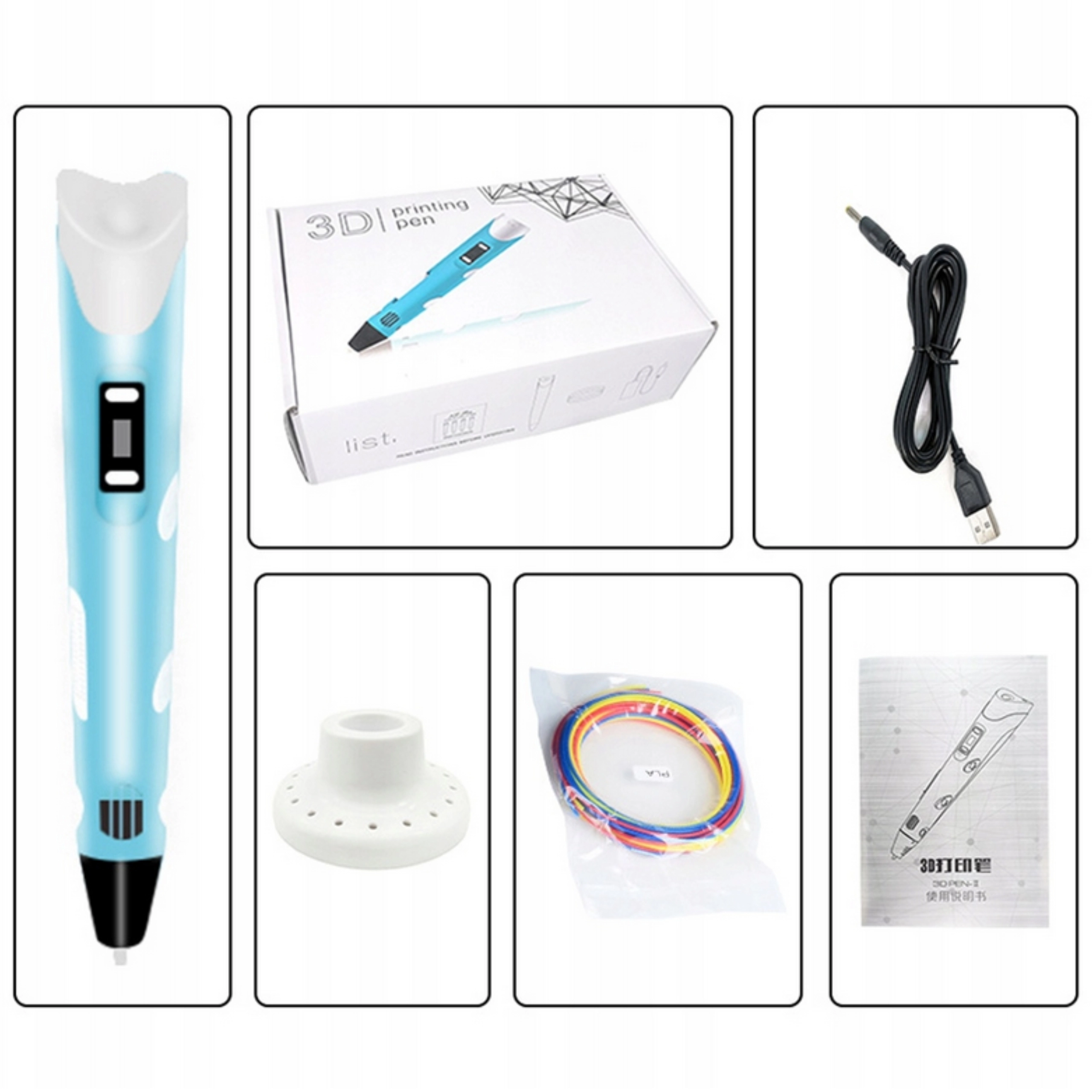 - 3D pero (1 ks), PLA filament 12 × 3 m (různé barvy), USB kabel (1 ks), návod (EN)