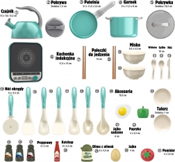 - Bohaté příslušenství: hrnce s pokličkami, pánev s vejcem, konvice, talířky a misky, příbory, zelenina, koření.