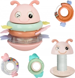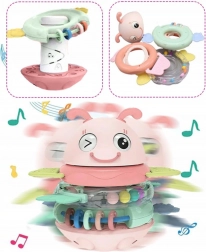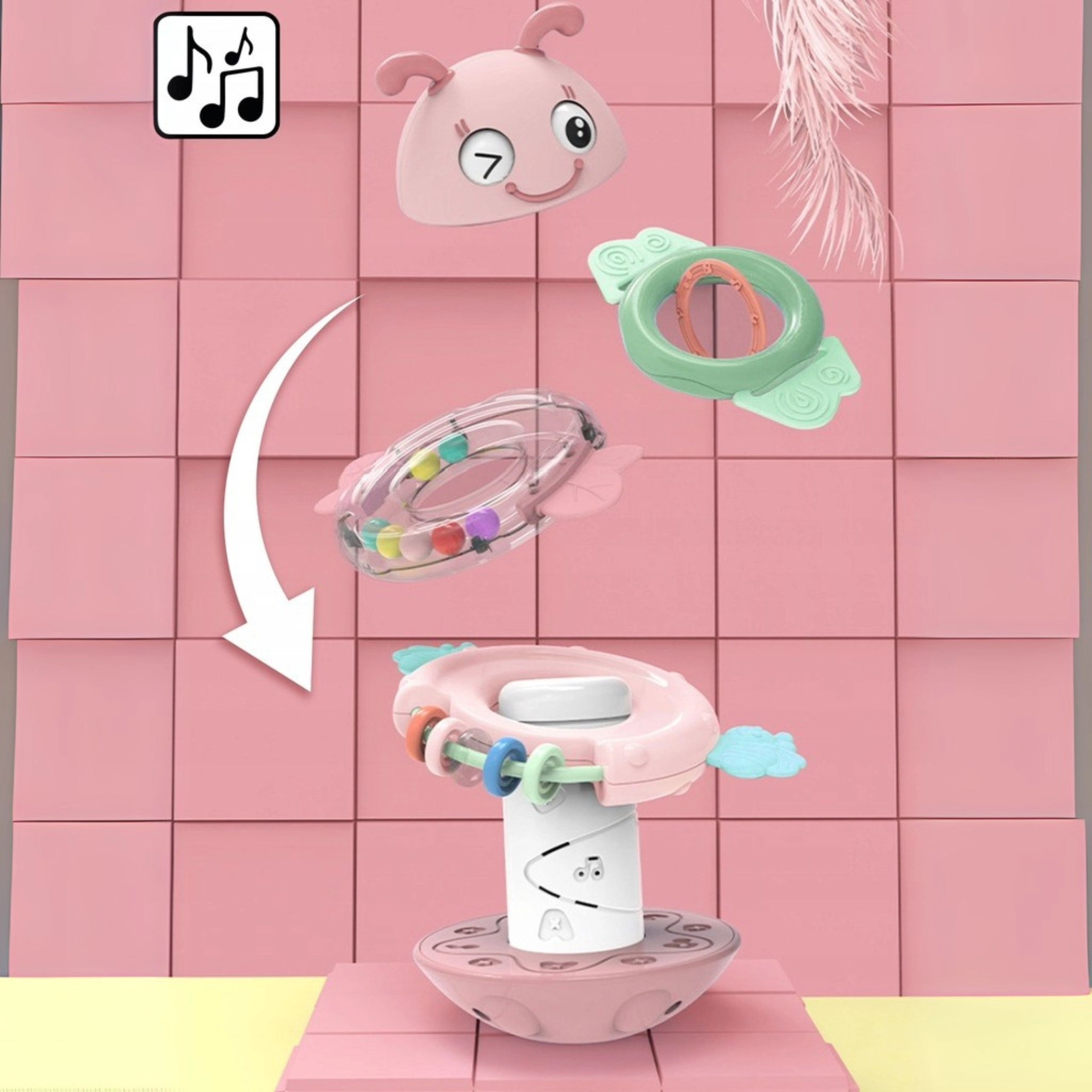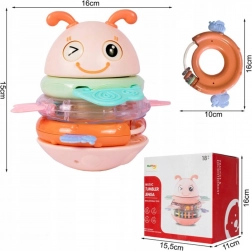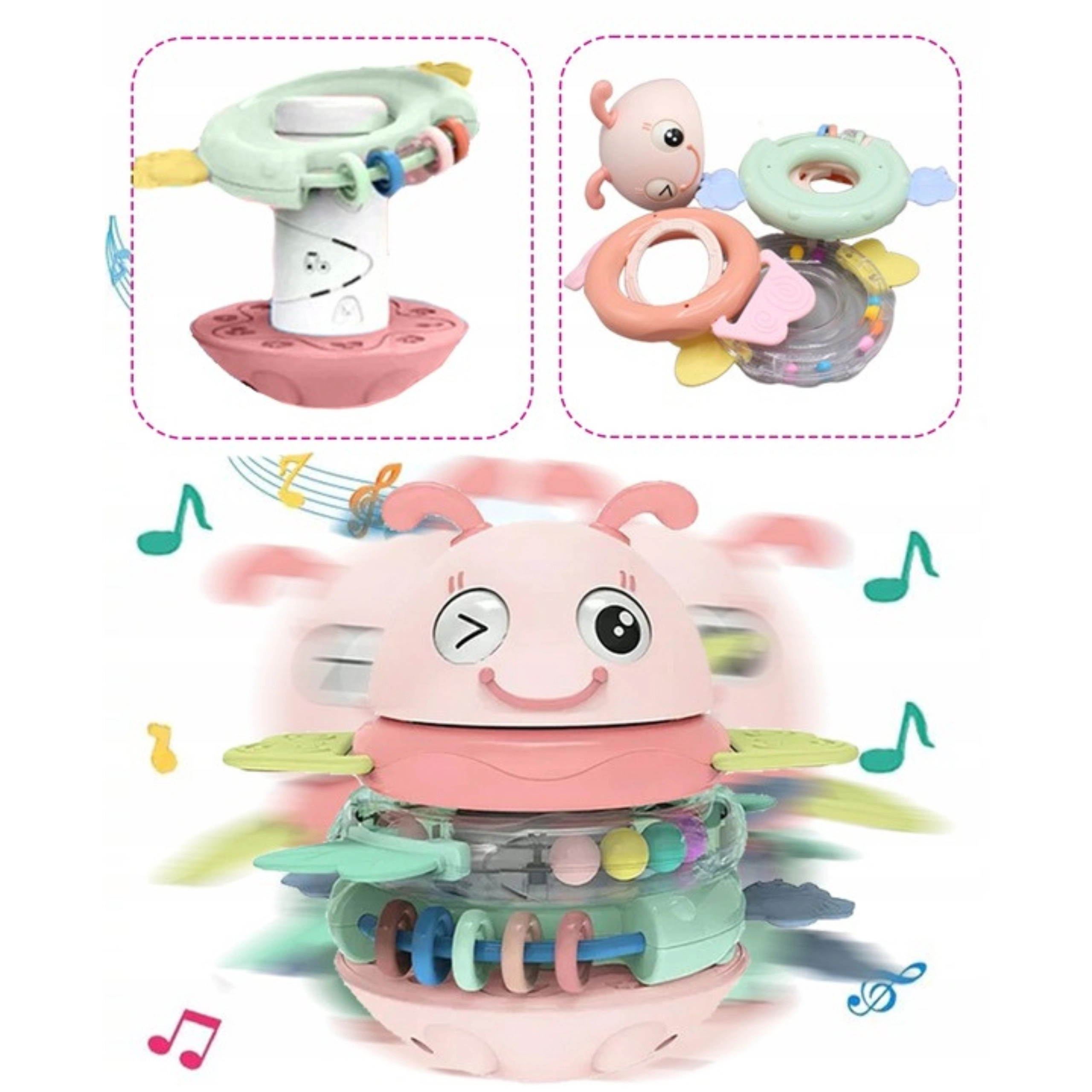 Hledáte hračku pro miminko, která zaujme, uklidní dásně a zároveň podpoří vývoj? Tato růžová včelka WOOPIE je multifunkční smyslová hračka vhodná od prvních měsíců. Kroužky lze používat samostatně jako kousátka a chrastítka, nebo je nasadit na kolík – hračka pak přehraje písničku či vydá legrační zvuk. Stabilní, zaoblená základna se jemně houpe a motivuje dítě k opakovanému zkoumání.