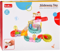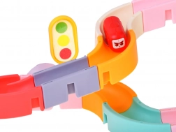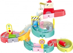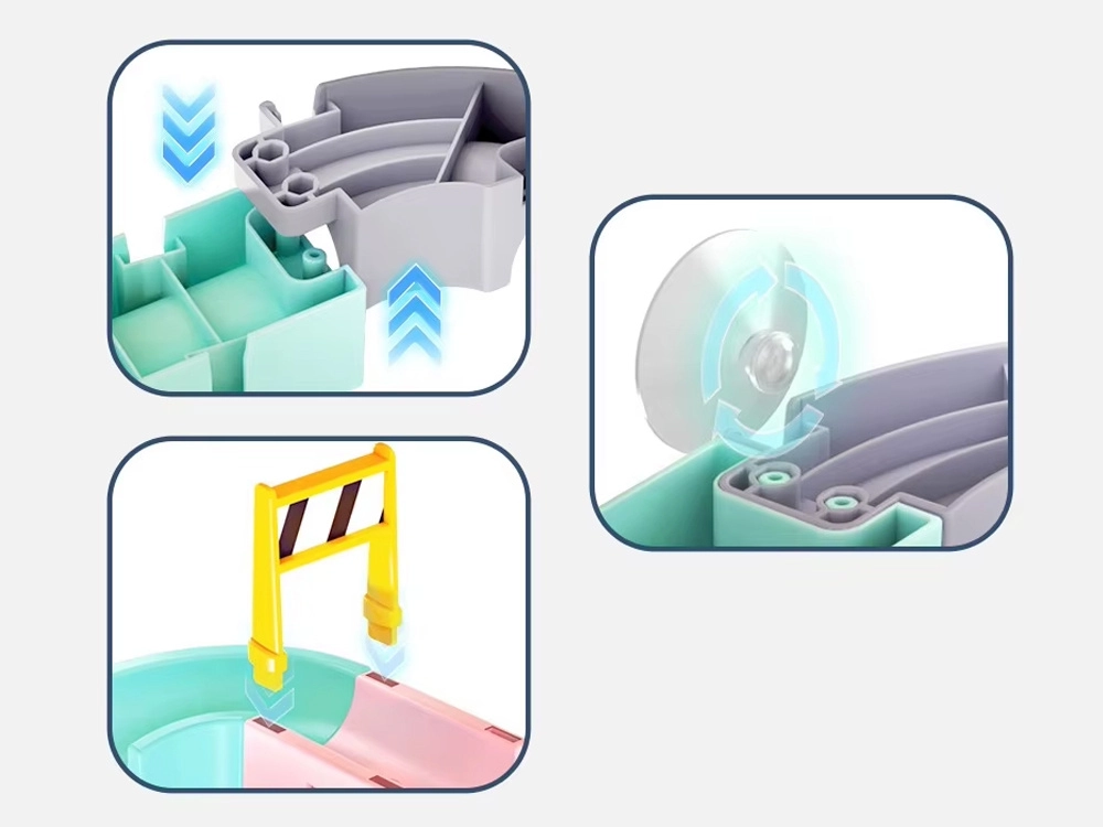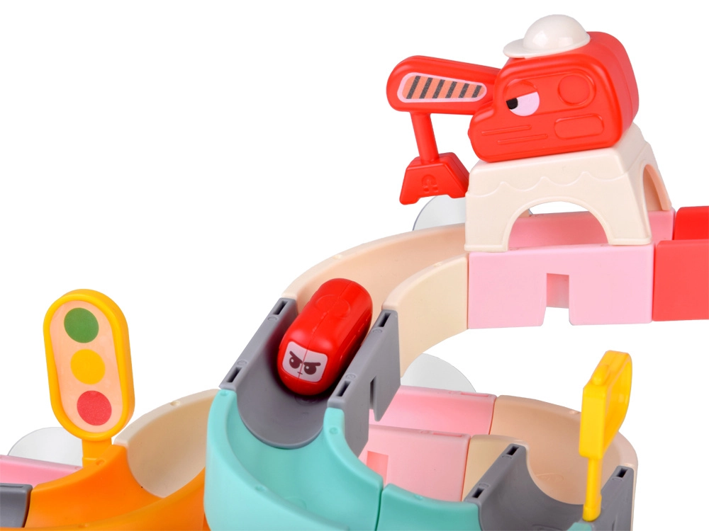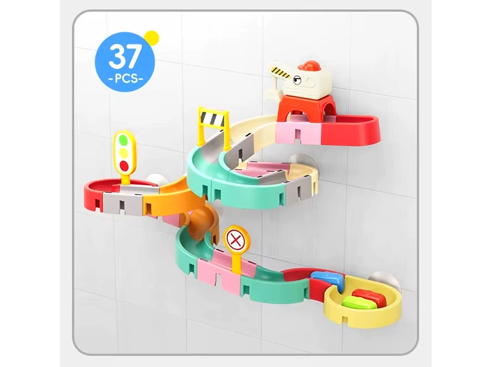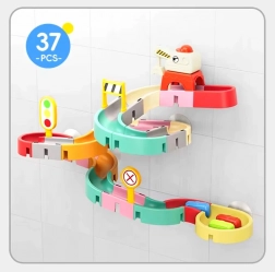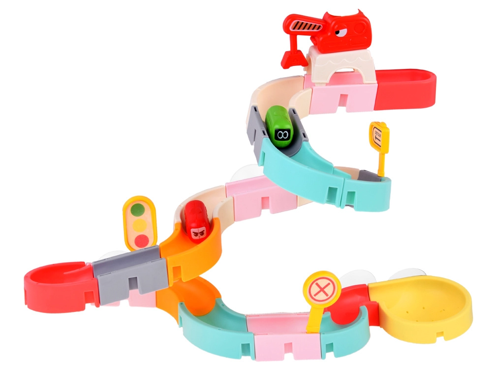Tento kreativní set do koupele zaujme děti barevnými díly, dopravní tématikou a vodními efekty. Z 37 komponentů sestavíte klikaté koryta a sjezdy, po kterých kapslová autíčka plují a kutálejí se s pomocí vody. Silikonové přísavky drží prvky pevně na hladkých površích a zakončení se sítkem vytváří zábavnou vodní spršku.