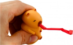 Hnědá kapybara s červenou trumpkou je vyrobena z příjemně měkkého a elastického materiálu, který se skvěle mačká a podporuje relaxaci. Při stisku se aktivuje pískací zvuk a z tlamičky se vysune trumpka, což z hračky dělá skvělý antistresový doplněk i originální zábavu pro skupinu.
