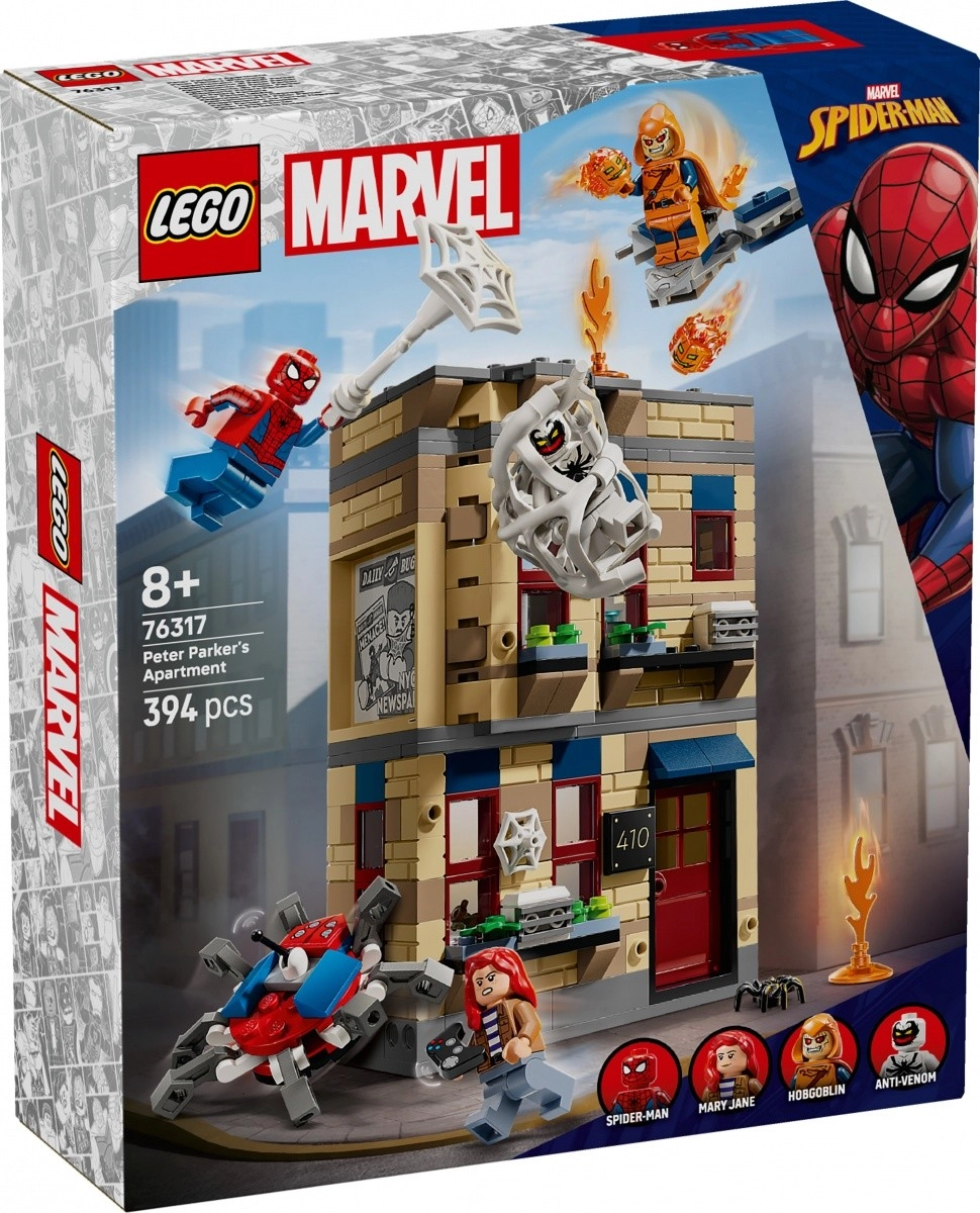 Tento sběratelský LEGO Marvel set přináší parádní akci přímo do Parkerova bytu. Uvnitř najdete kuchyň v přízemí a nahoře pracovnu a ložnici s rozkládací postelí, stolem, počítačem, fotoaparátem a mikroskopem. Nechybí funkce kolapsu stěny na stisk tlačítka a velká, ohebná pavučina, na kterou lze přichytit minifigurky.