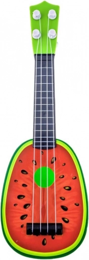 Roztomilé dětské ukulele s motivem melounu potěší malé hudebníky. Je lehké, odolné a pohodlně padne do dětských rukou. Má čtyři struny a ladicí mechaniku pro první krůčky ve světě hudby. Ideální jako dárek a k rozvoji rytmu i kreativity. Lehká konstrukce, zábavný ovocný design, 4 struny s laděním, kompaktní velikost 37 cm.