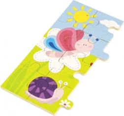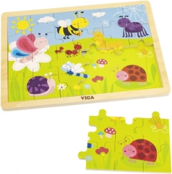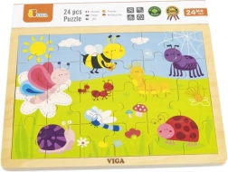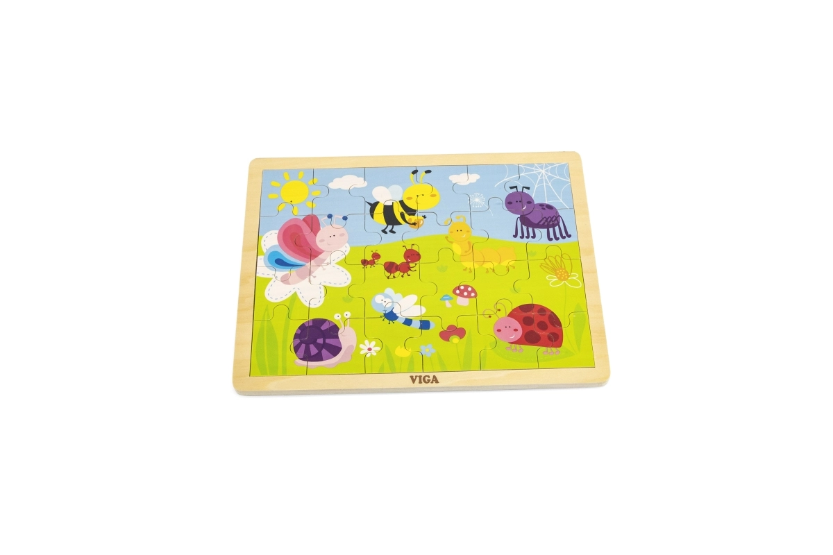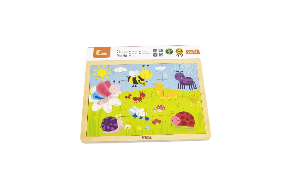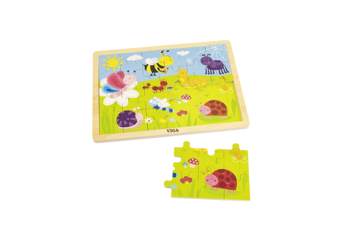 Objevte kvalitní dřevěné puzzle VIGA s ilustrací louky plné barevných broučků – včelky, motýla, berušky či šneka. Skládání 24 pevných dílků v rámečku podporuje trpělivost a soustředění, zatímco děti rozpoznávají tvary, barvy a detaily přátelské ilustrace.