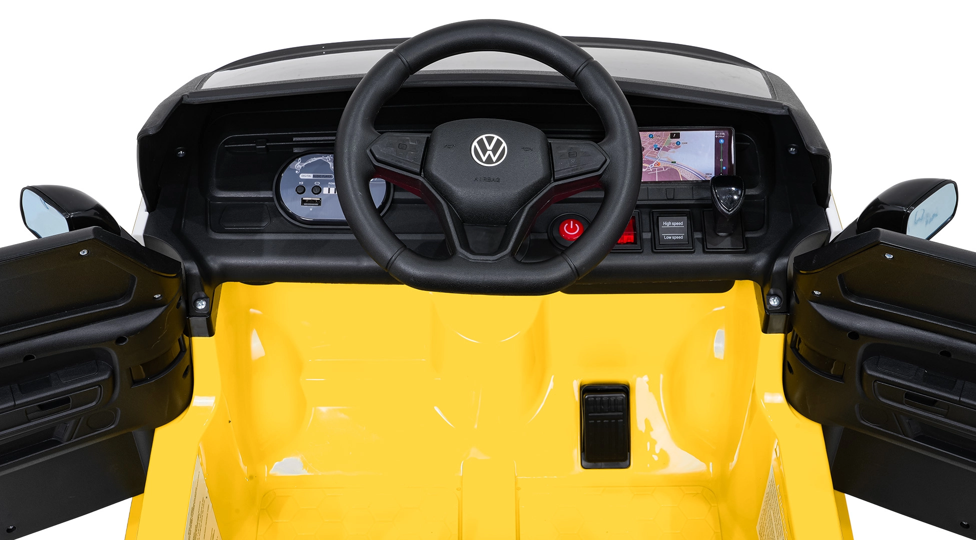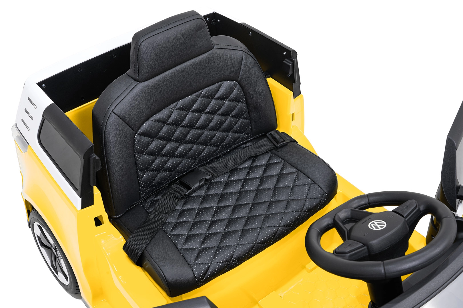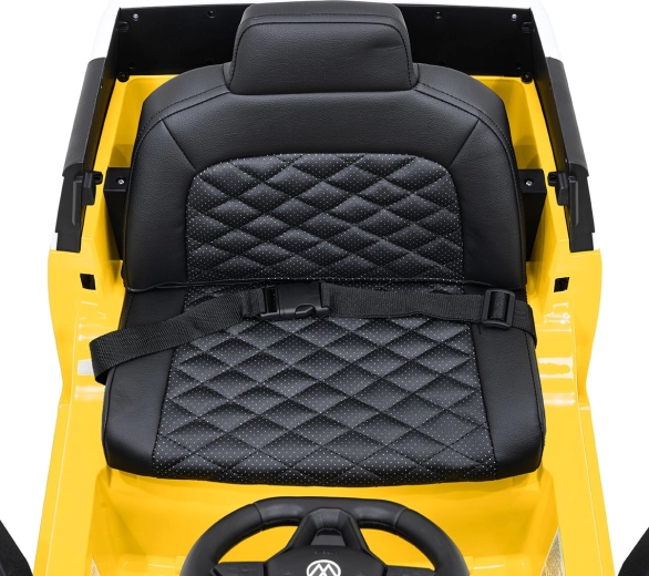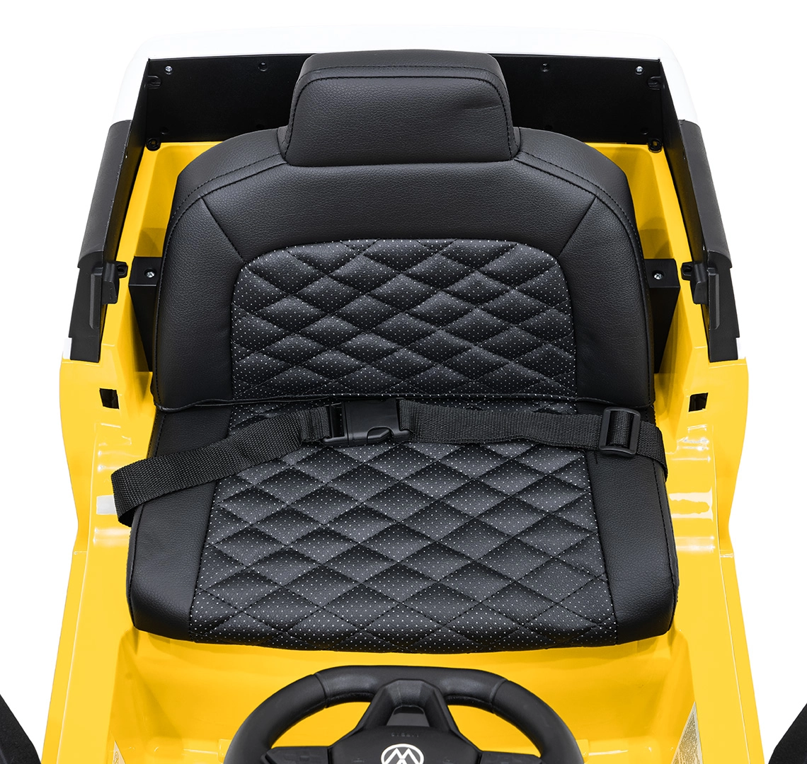 Bezpečí a pohodlí jsou na prvním místě: měkčené sedadlo z eko kůže s bezpečnostním pásem, dálkový ovladač 2,4 GHz se 3 rychlostmi a tlačítkem nouzového zastavení pro kontrolu dospělých. LED přední světla a spínač světel podtrhují realistický vzhled, otevírací dveře usnadňují nastupování a zadní úložný prostor pojme drobnosti na cesty.