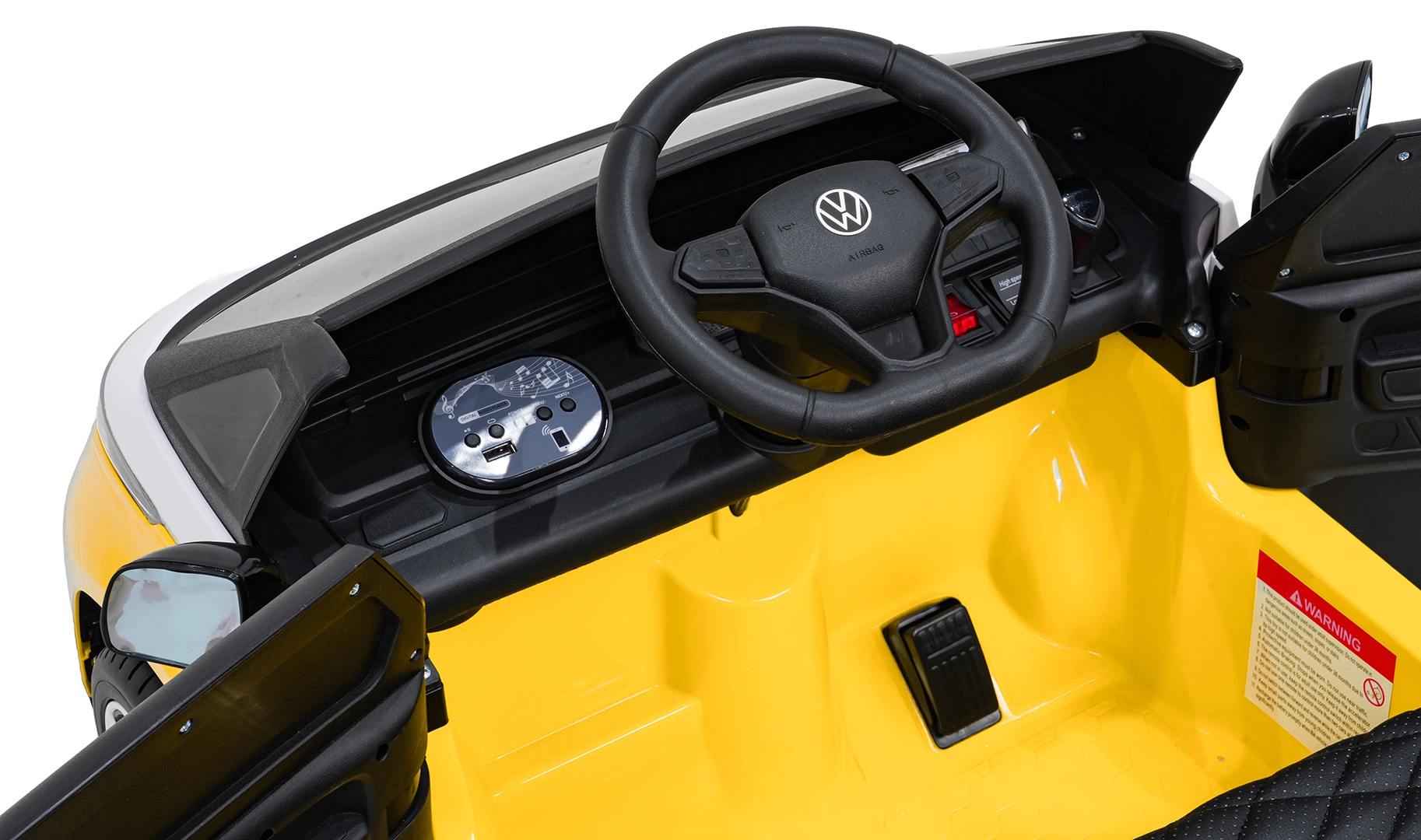 Připojte hudbu přes Bluetooth nebo USB, využijte MP3 a přednahrané melodie. Ovládání je přehledné a zábavné pro malé řidiče.