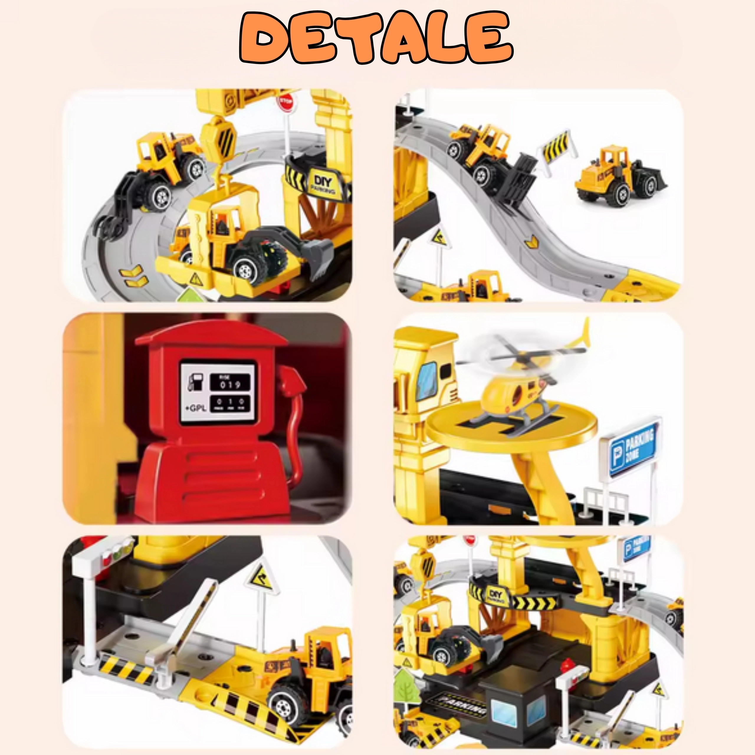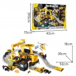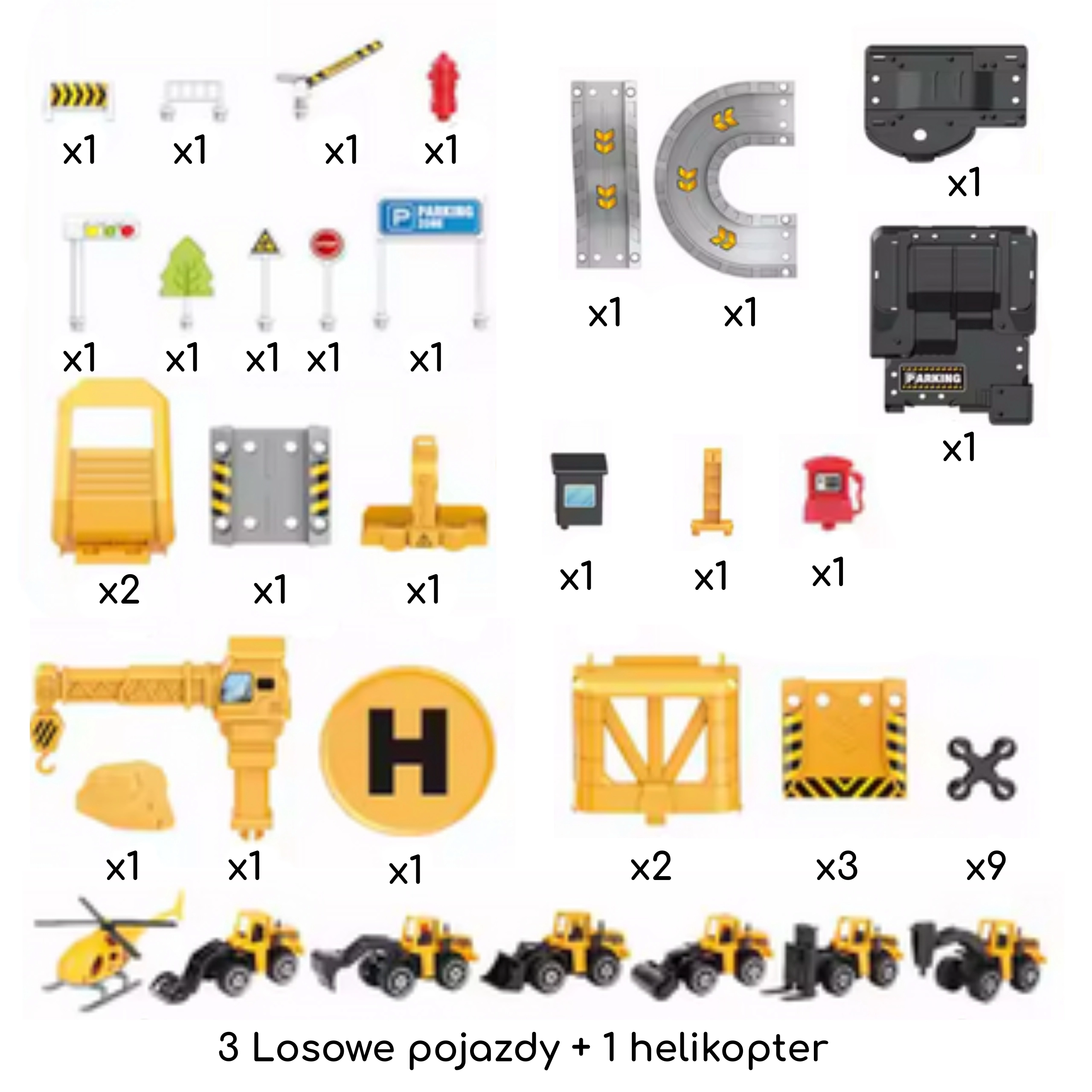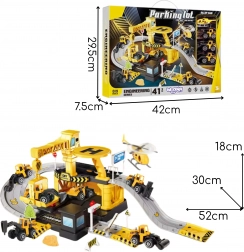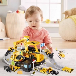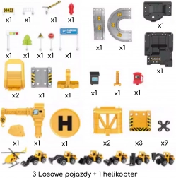 Set obsahuje 41 prvků, včetně 3 kovových stavebních autíček (náhodné modely) a helikoptéry, takže si děti mohou vytvářet vlastní scénáře a hrát si samostatně i s kamarády. Odolná plastová konstrukce a živé barvy zajišťují bezpečnou a atraktivní hru pro děti od 3 let.