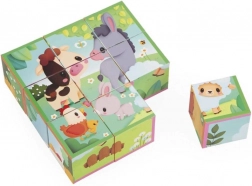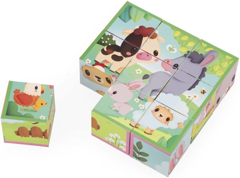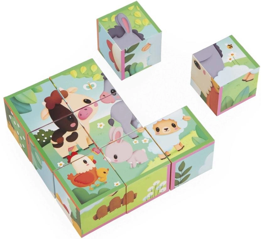 Tato klasická sada obrázkových kostek s motivy farmy přináší dětem radost z objevování a učení. Z 9 kvalitních dřevěných kostek snadno složíte 6 různých obrázků se zvířátky. Děti si procvičí skládání, třídění a orientaci v prostoru, zatímco si hrají.