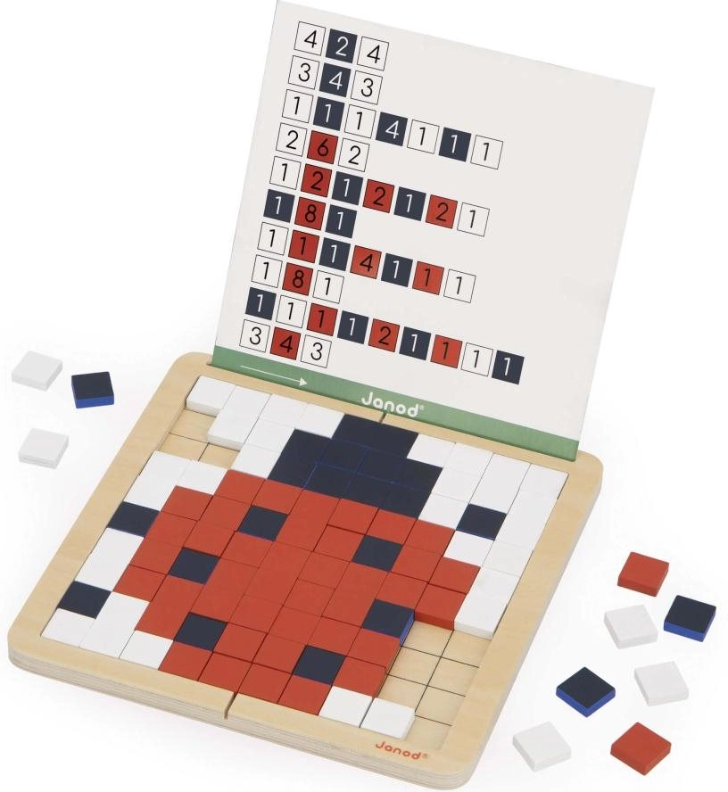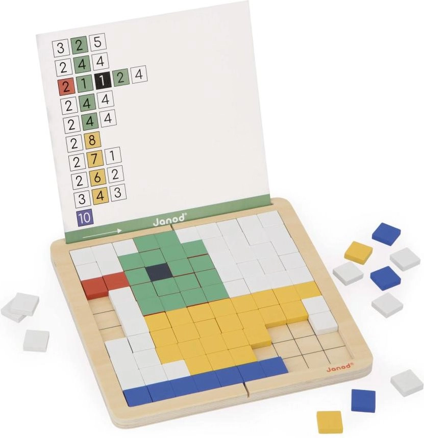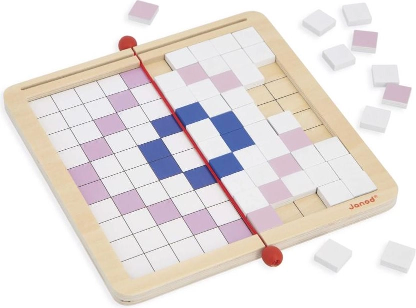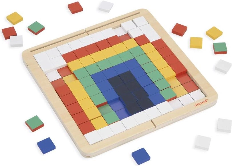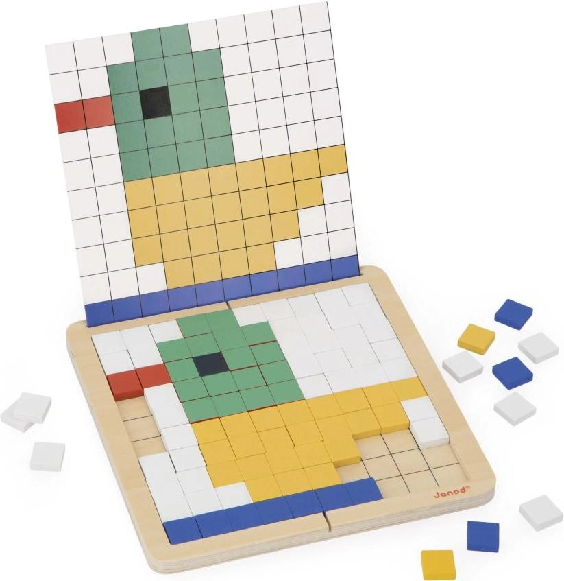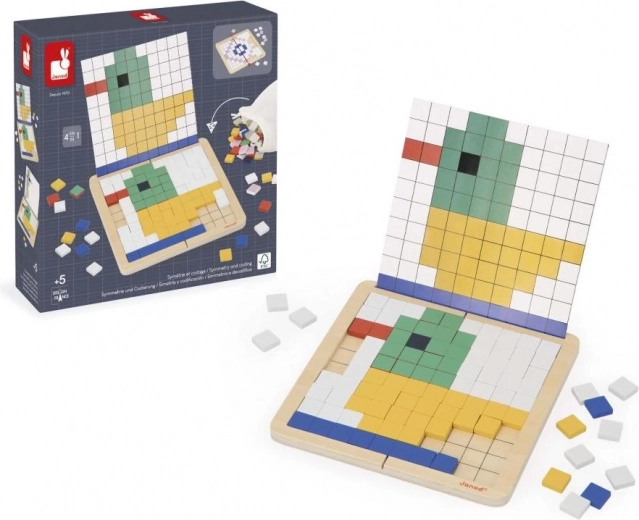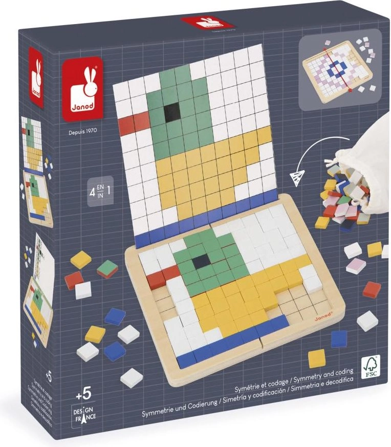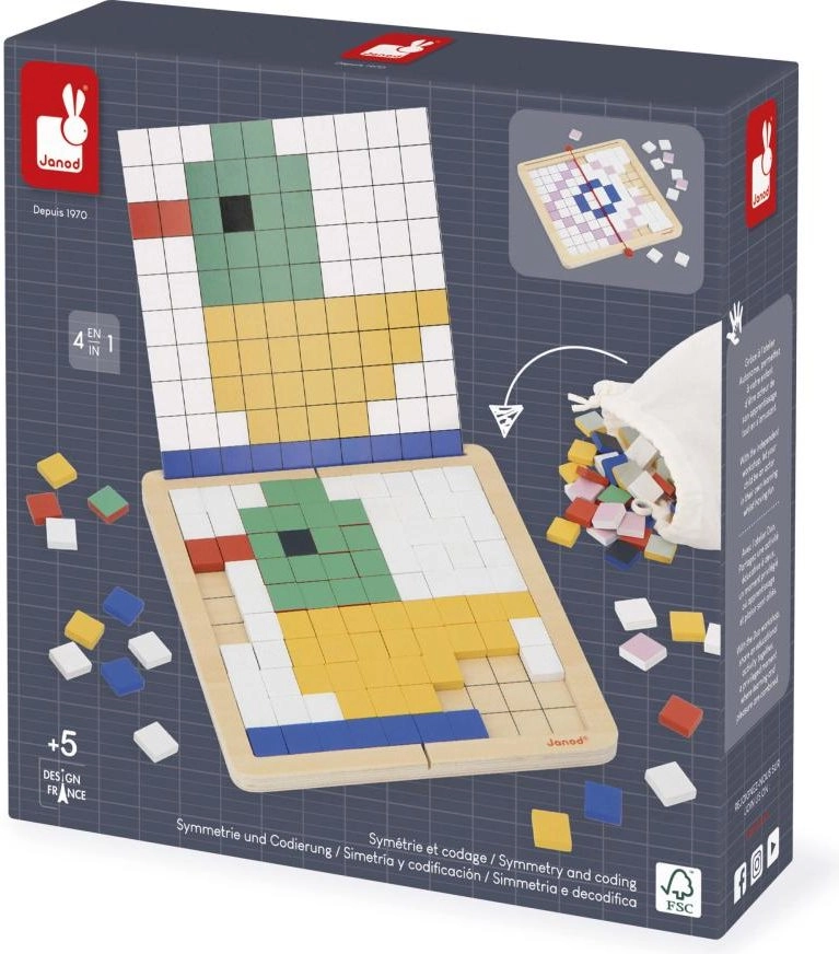 Rozvíjejte logiku, soustředění a prostorovou představivost s kreativní mozaikovou hrou od JANOD. Čtyři herní režimy – kopírování, reprodukce, symetrie a kódování – učí děti základům algoritmického myšlení a práce se vzory. Kvalitní dřevěná deska, až 200 barevných dlaždic, oboustranné karty se zadáními a praktický vak pro snadné ukládání.
