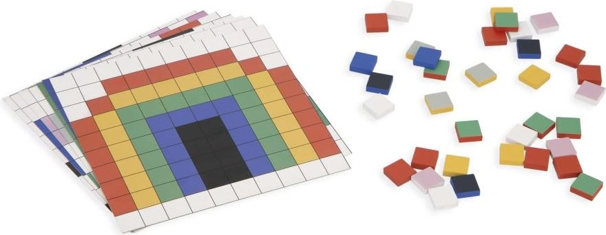 Velké množství dílků umožňuje tvořit desítky motivů, trénovat rozpoznávání barev, počítání i jemnou motoriku při přesném pokládání do mřížky.