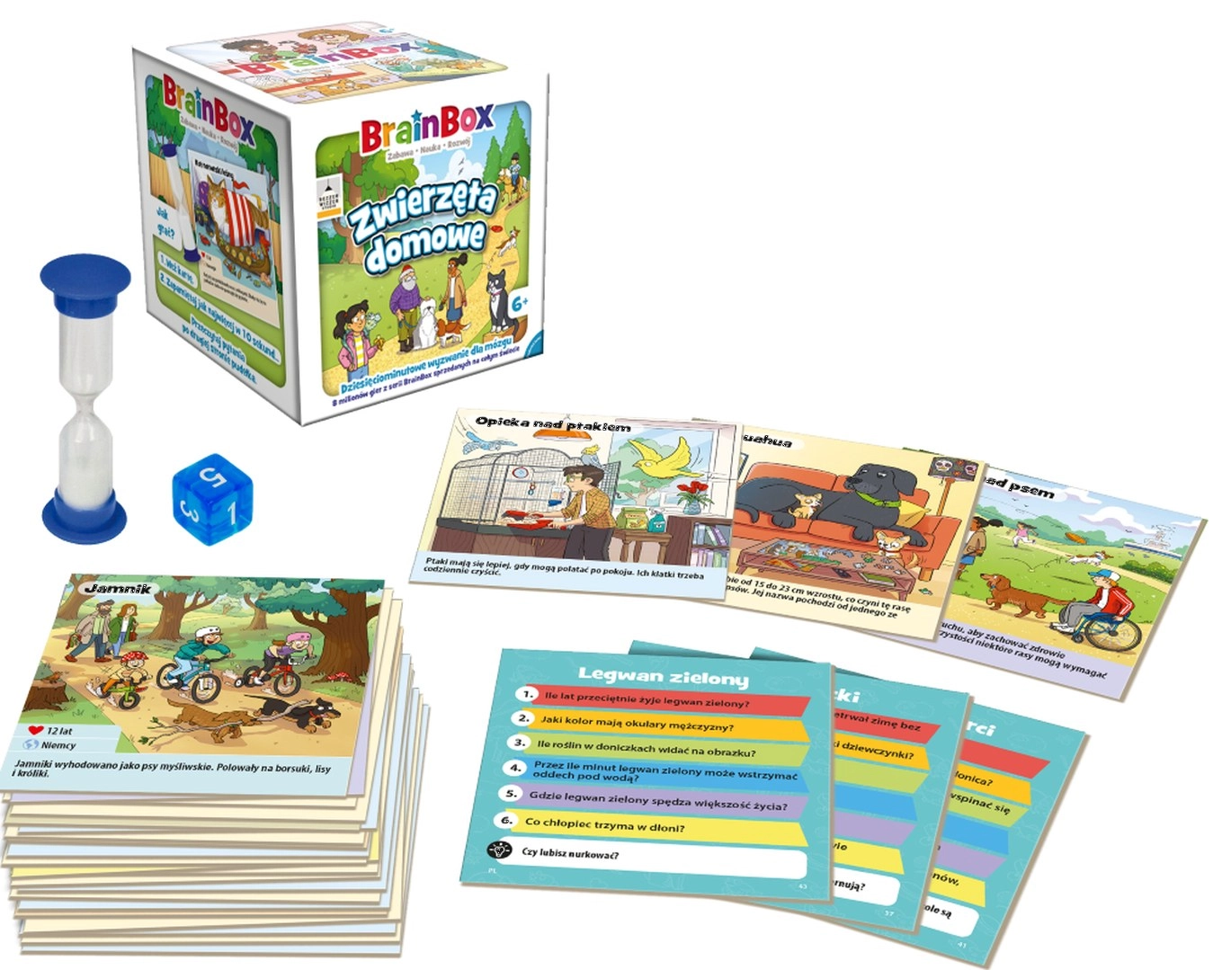 Vzdělávací hra BrainBox – domácí zvířata zavádí děti do světa psů, koček, ptáků, plazů i hlodavců. Každá z 55 karet obsahuje poutavou ilustraci a důležité informace o konkrétním zvířeti, jeho zvycích a správné péči. Dynamický mechanismus s přesýpacími hodinami podporuje trénink paměti a rychlé vnímání detailů.
