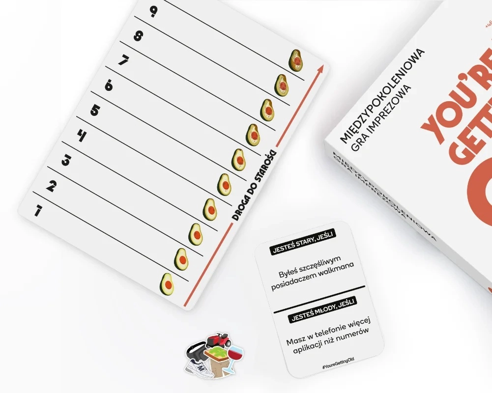 „You’re Getting Old“ je neotřelá karetní hra, která promění každý večer s přáteli v salvu smíchu. Losujte karty s výroky o tom, co je „mladé“ a co už je „stará škola“, a podle vlastních reakcí postupujte po desce vpřed či vzad. Vyhrává ten, kdo se nenechá stáhnout k cíli a udrží se co nejblíže startu.