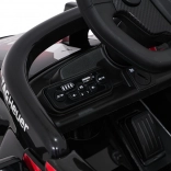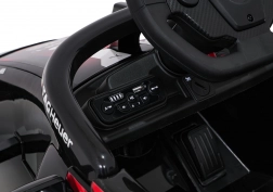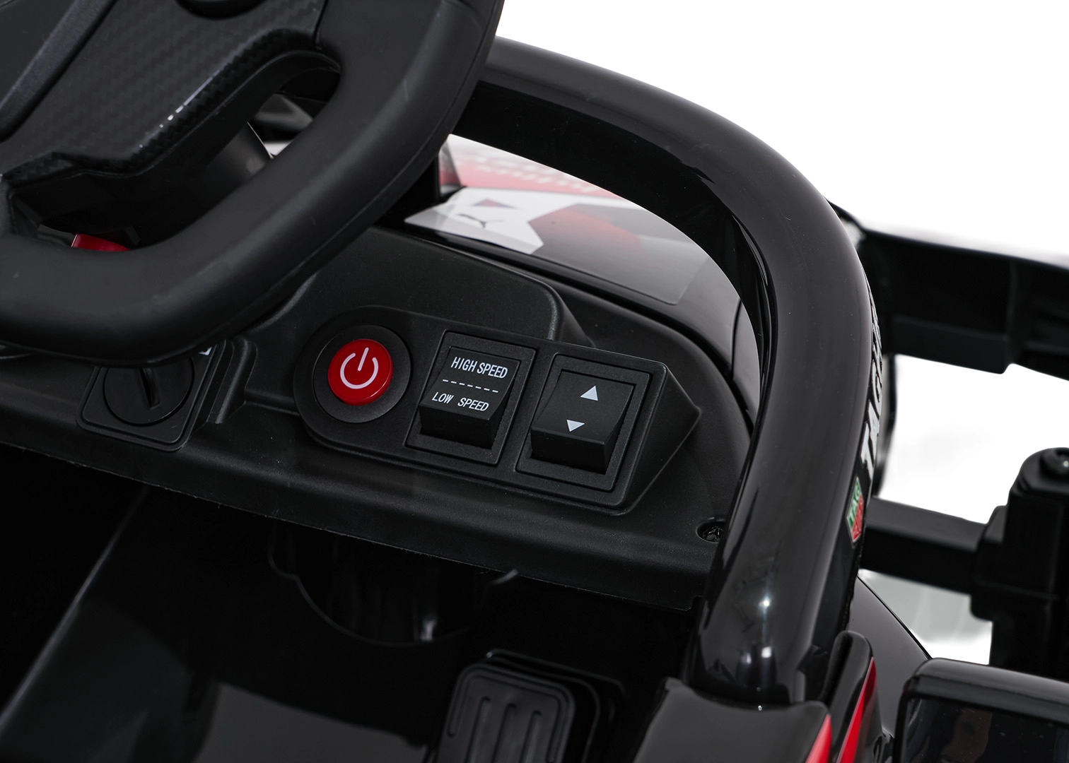 Dálkový ovladač 2,4 GHz se 3 rychlostmi a nouzovým Stop. Audio panel s Bluetooth/USB/MP3, zvuky a klaksonem na volantu.