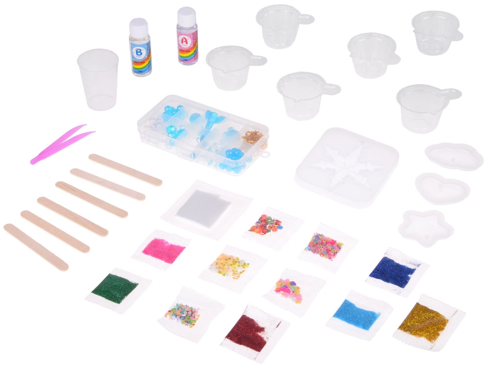 - Kompletní balení: pryskyřice A+B, formy, třpytky, korálky, nástroje, organizér