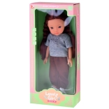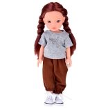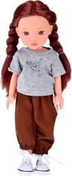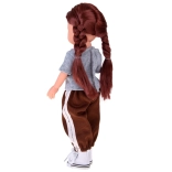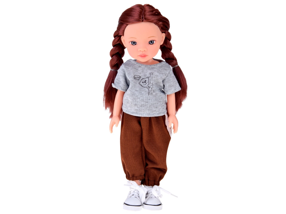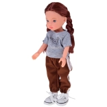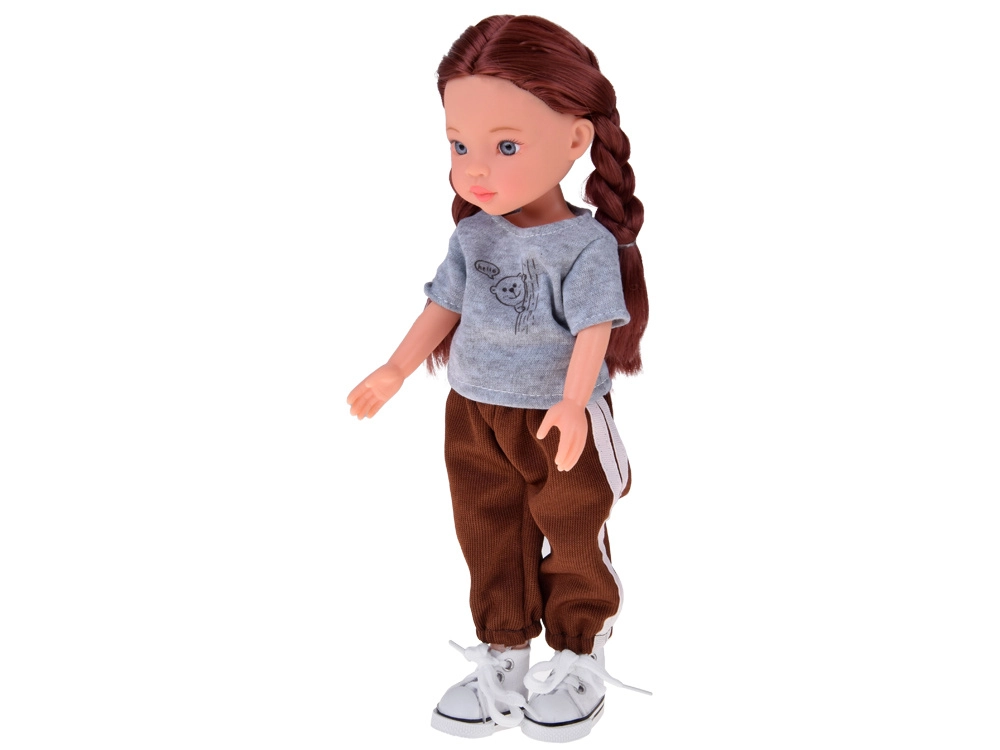 Panenka o výšce cca 33 cm je vyrobena z kvalitního plastu a díky artikulovaným rukám, nohám a hlavě ji lze snadno polohovat. Dlouhé, husté šaténové vlasy vybízejí k česání, zaplétání a stylování. Ležérní šedé tričko s potiskem, hnědé tepláky s bílými lampasy a bílé tenisky dotváří moderní sportovní vzhled.